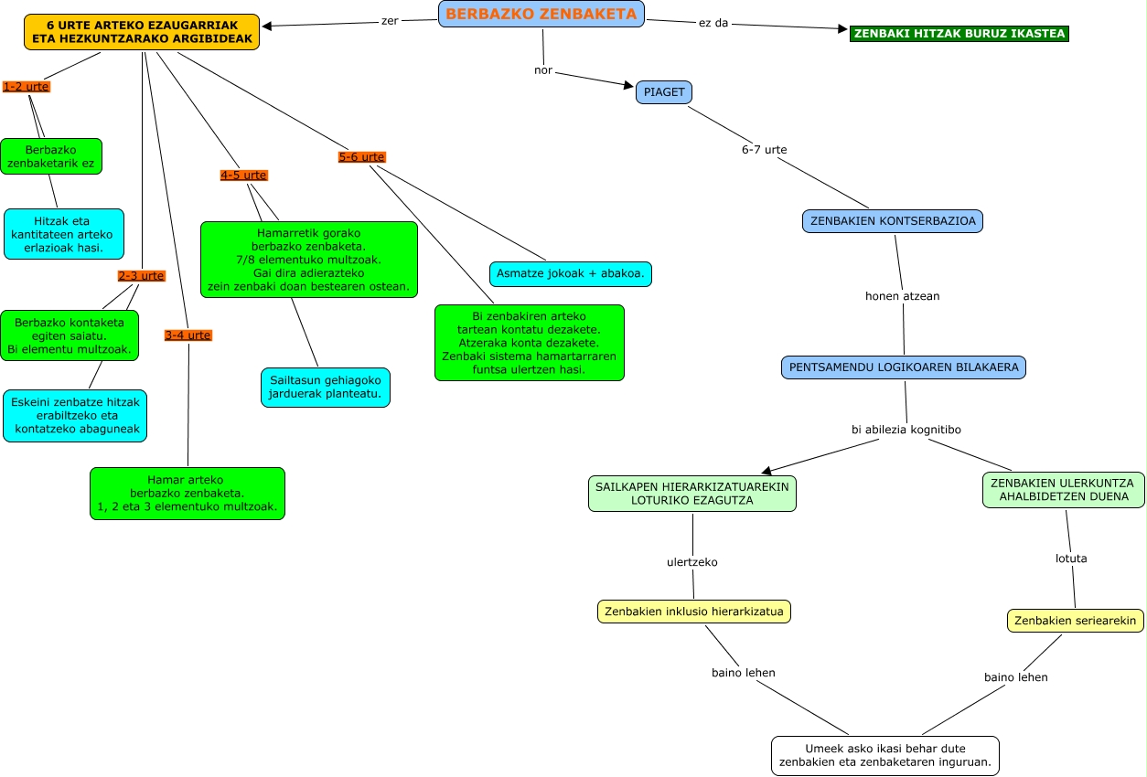 Este Cmap, tiene información relacionada con: berbazko zenbaketa, 6 URTE ARTEKO EZAUGARRIAK ETA HEZKUNTZARAKO ARGIBIDEAK 2-3 urte Berbazko kontaketa egiten saiatu. Bi elementu multzoak., ZENBAKIEN ULERKUNTZA AHALBIDETZEN DUENA lotuta Zenbakien seriearekin, PIAGET 6-7 urte ZENBAKIEN KONTSERBAZIOA, PENTSAMENDU LOGIKOAREN BILAKAERA bi abilezia kognitibo ZENBAKIEN ULERKUNTZA AHALBIDETZEN DUENA, BERBAZKO ZENBAKETA nor PIAGET, BERBAZKO ZENBAKETA ez da ZENBAKI HITZAK BURUZ IKASTEA, 6 URTE ARTEKO EZAUGARRIAK ETA HEZKUNTZARAKO ARGIBIDEAK 4-5 urte Hamarretik gorako berbazko zenbaketa. 7/8 elementuko multzoak. Gai dira adierazteko zein zenbaki doan bestearen ostean., 6 URTE ARTEKO EZAUGARRIAK ETA HEZKUNTZARAKO ARGIBIDEAK 1-2 urte Hitzak eta kantitateen arteko erlazioak hasi., 6 URTE ARTEKO EZAUGARRIAK ETA HEZKUNTZARAKO ARGIBIDEAK 5-6 urte Asmatze jokoak + abakoa., 6 URTE ARTEKO EZAUGARRIAK ETA HEZKUNTZARAKO ARGIBIDEAK 3-4 urte Hamar arteko berbazko zenbaketa. 1, 2 eta 3 elementuko multzoak., ZENBAKIEN KONTSERBAZIOA honen atzean PENTSAMENDU LOGIKOAREN BILAKAERA, Zenbakien inklusio hierarkizatua baino lehen Umeek asko ikasi behar dute zenbakien eta zenbaketaren inguruan., 6 URTE ARTEKO EZAUGARRIAK ETA HEZKUNTZARAKO ARGIBIDEAK 5-6 urte Bi zenbakiren arteko tartean kontatu dezakete. Atzeraka konta dezakete. Zenbaki sistema hamartarraren funtsa ulertzen hasi., 6 URTE ARTEKO EZAUGARRIAK ETA HEZKUNTZARAKO ARGIBIDEAK 2-3 urte Eskeini zenbatze hitzak erabiltzeko eta kontatzeko abaguneak, 6 URTE ARTEKO EZAUGARRIAK ETA HEZKUNTZARAKO ARGIBIDEAK 4-5 urte Sailtasun gehiagoko jarduerak planteatu., BERBAZKO ZENBAKETA zer 6 URTE ARTEKO EZAUGARRIAK ETA HEZKUNTZARAKO ARGIBIDEAK, Zenbakien seriearekin baino lehen Umeek asko ikasi behar dute zenbakien eta zenbaketaren inguruan., 6 URTE ARTEKO EZAUGARRIAK ETA HEZKUNTZARAKO ARGIBIDEAK 1-2 urte Berbazko zenbaketarik ez, SAILKAPEN HIERARKIZATUAREKIN LOTURIKO EZAGUTZA ulertzeko Zenbakien inklusio hierarkizatua, PENTSAMENDU LOGIKOAREN BILAKAERA bi abilezia kognitibo SAILKAPEN HIERARKIZATUAREKIN LOTURIKO EZAGUTZA