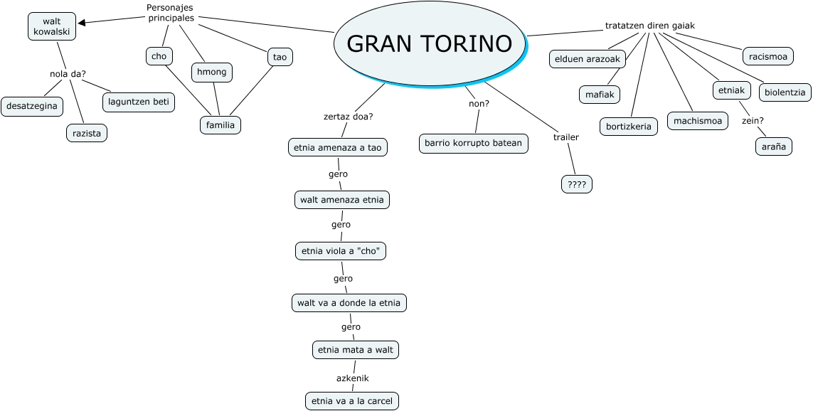 Este Cmap, tiene información relacionada con: gran torino, GRAN TORINO tratatzen diren gaiak racismoa, cho ???? familia, hmong ???? familia, walt kowalski nola da? laguntzen beti, GRAN TORINO tratatzen diren gaiak etniak, GRAN TORINO tratatzen diren gaiak machismoa, GRAN TORINO Personajes principales tao, GRAN TORINO zertaz doa? etnia amenaza a tao, walt amenaza etnia gero etnia viola a "cho", walt kowalski nola da? razista, GRAN TORINO tratatzen diren gaiak mafiak, GRAN TORINO tratatzen diren gaiak biolentzia, etnia mata a walt azkenik etnia va a la carcel, GRAN TORINO Personajes principales cho, etnia viola a "cho" gero walt va a donde la etnia, etnia amenaza a tao gero walt amenaza etnia, GRAN TORINO tratatzen diren gaiak elduen arazoak, tao ???? familia, GRAN TORINO non? barrio korrupto batean, etniak zein? araña