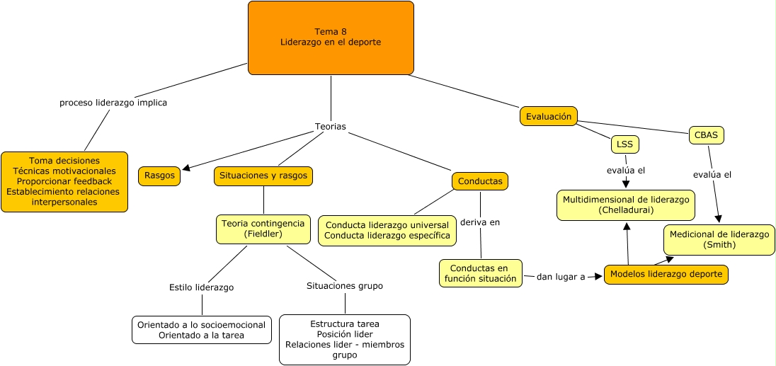 Este Cmap, tiene información relacionada con: T.8, Situaciones y rasgos ???? Teoria contingencia (Fieldler), Teoria contingencia (Fieldler) Situaciones grupo Estructura tarea Posición lider Relaciones lider - miembros grupo, Modelos liderazgo deporte ???? Medicional de liderazgo (Smith), Tema 8 Liderazgo en el deporte Teorias Rasgos, Evaluación ???? CBAS, Conductas en función situación dan lugar a Modelos liderazgo deporte, Tema 8 Liderazgo en el deporte Teorias Situaciones y rasgos, Conductas ???? Conducta liderazgo universal Conducta liderazgo específica, Tema 8 Liderazgo en el deporte Teorias Conductas, Conductas deriva en Conductas en función situación, Modelos liderazgo deporte ???? Multidimensional de liderazgo (Chelladurai), CBAS evalúa el Medicional de liderazgo (Smith), Evaluación ???? LSS, Teoria contingencia (Fieldler) Estilo liderazgo Orientado a lo socioemocional Orientado a la tarea, LSS evalúa el Multidimensional de liderazgo (Chelladurai), Tema 8 Liderazgo en el deporte proceso liderazgo implica Toma decisiones Técnicas motivacionales Proporcionar feedback Establecimiento relaciones interpersonales, Tema 8 Liderazgo en el deporte ???? Evaluación