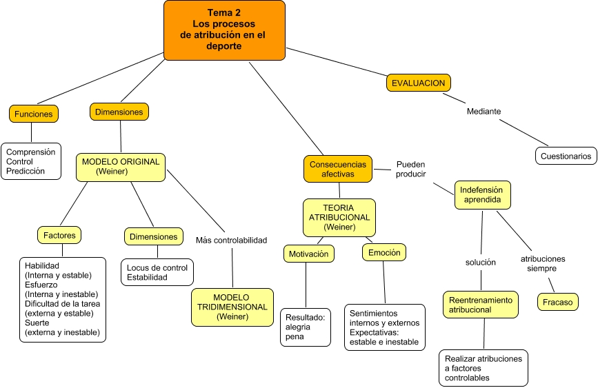 Este Cmap, tiene información relacionada con: T.2, Tema 2 Los procesos de atribución en el deporte ???? Consecuencias afectivas, TEORIA ATRIBUCIONAL (Weiner) ???? Consecuencias afectivas, Factores ???? Habilidad (Interna y estable) Esfuerzo (Interna y inestable) Dificultad de la tarea (externa y estable) Suerte (externa y inestable), Motivación ???? TEORIA ATRIBUCIONAL (Weiner), Reentrenamiento atribucional ???? Realizar atribuciones a factores controlables, Tema 2 Los procesos de atribución en el deporte ???? Funciones, Emoción ???? TEORIA ATRIBUCIONAL (Weiner), MODELO ORIGINAL (Weiner) Más controlabilidad MODELO TRIDIMENSIONAL (Weiner), Funciones ???? Comprensión Control Predicción, Tema 2 Los procesos de atribución en el deporte ???? Dimensiones, MODELO ORIGINAL (Weiner) ???? Dimensiones, Indefensión aprendida atribuciones siempre Fracaso, Consecuencias afectivas Pueden producir Indefensión aprendida, Tema 2 Los procesos de atribución en el deporte ???? EVALUACION, MODELO ORIGINAL (Weiner) ???? Factores, Dimensiones ???? Locus de control Estabilidad, Motivación ???? Resultado: alegria pena, Dimensiones ???? MODELO ORIGINAL (Weiner), Emoción ???? Sentimientos internos y externos Expectativas: estable e inestable, Indefensión aprendida solución Reentrenamiento atribucional
