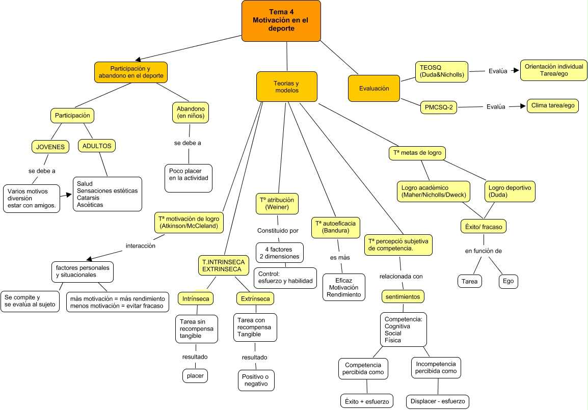 Este Cmap, tiene información relacionada con: T.4, Competencia percibida como ???? Éxito + esfuerzo, Participación ???? ADULTOS, Éxito/ fracaso en función de Tarea, T.INTRINSECA EXTRINSECA ???? Intrínseca, Tema 4 Motivación en el deporte ???? Evaluación, Teorias y modelos ???? T.INTRINSECA EXTRINSECA, Teorias y modelos ???? Tº atribución (Weiner), Tª percepció subjetiva de competencia. relacionada con sentimientos, Teorias y modelos ???? Tª metas de logro, Teorias y modelos ???? Tª percepció subjetiva de competencia., Éxito/ fracaso en función de Ego, Abandono (en niños) se debe a Poco placer en la actividad, Evaluación ???? TEOSQ (Duda&Nicholls), Tarea sin recompensa tangible resultado placer, Logro deportivo (Duda) ???? Éxito/ fracaso, Tema 4 Motivación en el deporte ???? Participación y abandono en el deporte, Tarea con recompensa Tangible resultado Positivo o negativo, TEOSQ (Duda&Nicholls) Evalúa Orientación individual Tarea/ego, Incompetencia percibida como ???? Displacer - esfuerzo, Tª metas de logro ???? Logro deportivo (Duda)