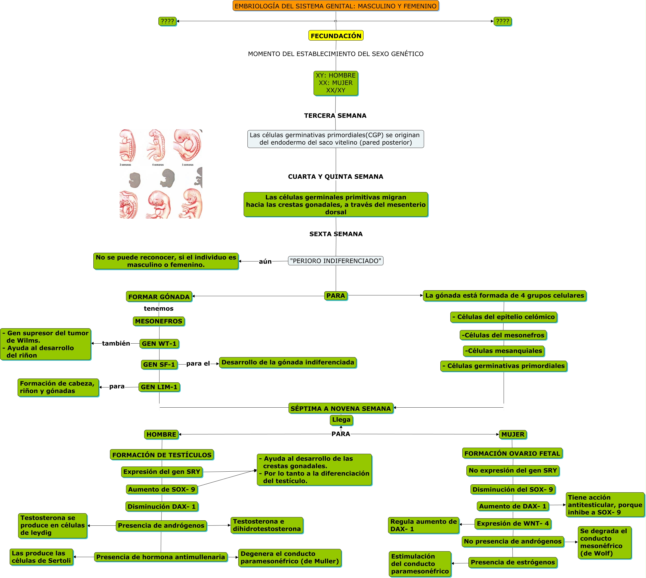 Este Cmap, tiene información relacionada con: Embriología, XY: HOMBRE XX: MUJER XX/XY TERCERA SEMANA Las células germinativas primordiales(CGP) se originan del endodermo del saco vitelino (pared posterior), Expresión de WNT- 4 ???? No presencia de andrógenos, Aumento de SOX- 9 ???? - Ayuda al desarrollo de las crestas gonadales. - Por lo tanto a la diferenciación del testículo., Las células germinativas primordiales(CGP) se originan del endodermo del saco vitelino (pared posterior) CUARTA Y QUINTA SEMANA Las células germinales primitivas migran hacia las crestas gonadales, a través del mesenterio dorsal, EMBRIOLOGÍA DEL SISTEMA GENITAL: MASCULINO Y FEMENINO es FECUNDACIÓN, GEN LIM-1 ????, "PERIORO INDIFERENCIADO" ???? PARA, Presencia de andrógenos ???? Testosterona se produce en células de leydig, - Células del epitelio celómico ???? -Células del mesonefros, HOMBRE ???? FORMACIÓN DE TESTÍCULOS, Presencia de estrógenos ???? Estimulación del conducto paramesonéfrico, -Células del mesonefros ???? -Células mesanquiales, Las células germinales primitivas migran hacia las crestas gonadales, a través del mesenterio dorsal SEXTA SEMANA "PERIORO INDIFERENCIADO", "PERIORO INDIFERENCIADO" aún No se puede reconocer, si el individuo es masculino o femenino., Presencia de hormona antimullenaria ???? Degenera el conducto paramesonéfrico (de Muller), GEN WT-1 ???? GEN SF-1, GEN LIM-1 para Formación de cabeza, riñon y gónadas, Disminución DAX- 1 ???? Presencia de andrógenos, MESONEFROS ???? GEN WT-1, SÉPTIMA A NOVENA SEMANA PARA HOMBRE