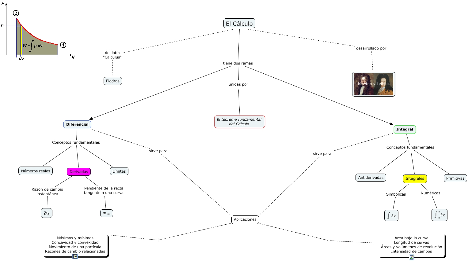 Este Cmap, tiene información relacionada con: Calculo, Límites Conceptos fundamentales Derivadas, Integral Conceptos fundamentales Antiderivadas, unidas por El teorema fundamental del Cálculo, Integral sirve para Aplicaciones, Derivadas Pendiente de la recta tangente a una curva <math xmlns="http://www.w3.org/1998/Math/MathML"> <mrow> <mmultiscripts> <mtext> m </mtext> <mtext> tan </mtext> <none/> </mmultiscripts> </mrow> </math>, Diferencial sirve para Aplicaciones, Límites Conceptos fundamentales Números reales, Integrales Simbólicas <math xmlns="http://www.w3.org/1998/Math/MathML"> <mrow> <int/> <mtext> ∂x </mtext> </mrow> </math>, El Cálculo tiene dos ramas Integral, El Cálculo desarrollado por Newton y Leibniz, Aplicaciones Área bajo la curva Longitud de curvas Áreas y volúmenes de revolución Intensidad de campos, El Cálculo tiene dos ramas unidas por, Diferencial Conceptos fundamentales Derivadas, Integral Conceptos fundamentales Primitivas, El Cálculo tiene dos ramas Diferencial, Integrales Numéricas <math xmlns="http://www.w3.org/1998/Math/MathML"> <mrow> <mmultiscripts> <int/> <mtext> b </mtext> <mtext> a </mtext> </mmultiscripts> <mtext> ∂x </mtext> </mrow> </math>, Integral Conceptos fundamentales Integrales, Derivadas Razón de cambio instantánea ∂x, Aplicaciones Máximos y mínimos Concavidad y convexidad Movimiento de una partícula Razones de cambio relacionadas, Diferencial Conceptos fundamentales Números reales