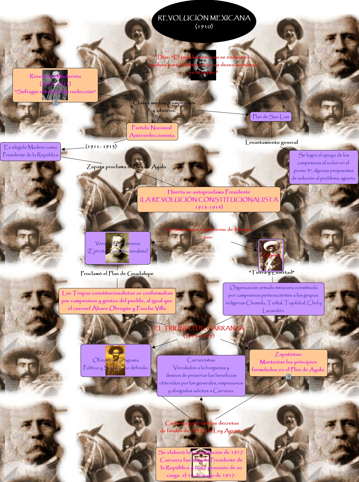 Este Cmap, tiene información relacionada con: REVOLUCION MEXICANA, Partido Nacional Antirreeleccionista. (1911- 1913) Es elegido Madero como Presidente de la República, REVOLUCIÓN MEXICANA (1910) Díaz: "El pueblo mexicano se encuentra maduro para la democracia, no deseo continuar en el poder." Revolución Maderista (1910- 1911) "Sufragio efectivo, No reelección", Huerta se autoproclama Presidente (LA REVOLUCIÓN CONSTITUCIONALISTA 1913-1914) Se desconoce el gobierno de Huerta por: Zapata, Huerta se autoproclama Presidente (LA REVOLUCIÓN CONSTITUCIONALISTA 1913-1914) Se desconoce el gobierno de Huerta por: Venustiano Carranza (Ejército Constitucionalista), Organización armada mexicana constituida por campesinos pertenecientes a los grupos indígenas Chamula, Tzeltal, Tojolabal, Chol y Lacandón. EL TRIUNFO DE CARRANZA (1914- 1919) Zapatistas: Mantenían los principios formulados en el Plan de Ayala., Organización armada mexicana constituida por campesinos pertenecientes a los grupos indígenas Chamula, Tzeltal, Tojolabal, Chol y Lacandón. EL TRIUNFO DE CARRANZA (1914- 1919) Carrancistas: Vinculados a la burguesía y deseos de preservar los beneficios obtenidos por los generales, empresarios y abogados adictos a Carranza., Revolución Maderista (1910- 1911) "Sufragio efectivo, No reelección" Clases medias, campesinos y obreros. Plan de San Luis, Plan de San Luis Levantamiento general Se logró el apoyo de los campesinos al incluir en el punto 3º, algunas propuestas de solución al problema agrario., Organización armada mexicana constituida por campesinos pertenecientes a los grupos indígenas Chamula, Tzeltal, Tojolabal, Chol y Lacandón. EL TRIUNFO DE CARRANZA (1914- 1919) Las Tropas constitucionalistas se conformaban por campesinos y gentes del pueblo, al igual que el coronel Álvaro Obregón y Pancho Villa., Villistas: Ofrecían un programa Político y Social poco definido. Carranza gana con los decretos de finales de 1914 y la Ley Agraria. Carrancistas: Vinculados a la burguesía y deseos de preservar los beneficios obtenidos por los generales, empresarios y abogados adictos a Carranza., Zapata "Tierra y Libertad" Organización armada mexicana constituida por campesinos pertenecientes a los grupos indígenas Chamula, Tzeltal, Tojolabal, Chol y Lacandón., Venustiano Carranza (Ejército Constitucionalista) Proclamó el Plan de Guadalupe Las Tropas constitucionalistas se conformaban por campesinos y gentes del pueblo, al igual que el coronel Álvaro Obregón y Pancho Villa., Organización armada mexicana constituida por campesinos pertenecientes a los grupos indígenas Chamula, Tzeltal, Tojolabal, Chol y Lacandón. EL TRIUNFO DE CARRANZA (1914- 1919) Villistas: Ofrecían un programa Político y Social poco definido., Villistas: Ofrecían un programa Político y Social poco definido. Carranza gana con los decretos de finales de 1914 y la Ley Agraria. Se elaboró la Constitución de 1917. Carranza fue elegido Presidente de la República y tomó posesión de su cargo el 10 de mayo de 1917., Es elegido Madero como Presidente de la República Zapata proclama el Plan de Ayala Huerta se autoproclama Presidente (LA REVOLUCIÓN CONSTITUCIONALISTA 1913-1914), Villistas: Ofrecían un programa Político y Social poco definido. Carranza gana con los decretos de finales de 1914 y la Ley Agraria. Zapatistas: Mantenían los principios formulados en el Plan de Ayala., Revolución Maderista (1910- 1911) "Sufragio efectivo, No reelección" Clases medias, campesinos y obreros. Partido Nacional Antirreeleccionista.