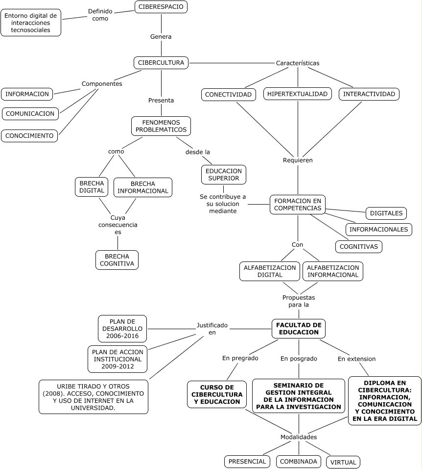 Este Cmap, tiene información relacionada con: Propuesta-Educacion, ALFABETIZACION INFORMACIONAL Propuestas para la FACULTAD DE EDUCACION, ALFABETIZACION DIGITAL Propuestas para la FACULTAD DE EDUCACION, FORMACION EN COMPETENCIAS Con ALFABETIZACION DIGITAL, CURSO DE CIBERCULTURA Y EDUCACION Modalidades COMBINADA, CIBERCULTURA Características HIPERTEXTUALIDAD, SEMINARIO DE GESTION INTEGRAL DE LA INFORMACION PARA LA INVESTIGACION Modalidades COMBINADA, FENOMENOS PROBLEMATICOS como BRECHA INFORMACIONAL, SEMINARIO DE GESTION INTEGRAL DE LA INFORMACION PARA LA INVESTIGACION Modalidades PRESENCIAL, FACULTAD DE EDUCACION Justificado en PLAN DE DESARROLLO 2006-2016, FORMACION EN COMPETENCIAS ???? INFORMACIONALES, CIBERCULTURA Componentes INFORMACION, FORMACION EN COMPETENCIAS ???? DIGITALES, HIPERTEXTUALIDAD Requieren FORMACION EN COMPETENCIAS, BRECHA INFORMACIONAL Cuya consecuencia es BRECHA COGNITIVA, FENOMENOS PROBLEMATICOS como BRECHA DIGITAL, FORMACION EN COMPETENCIAS Con ALFABETIZACION INFORMACIONAL, DIPLOMA EN CIBERCULTURA: INFORMACION, COMUNICACION Y CONOCIMIENTO EN LA ERA DIGITAL Modalidades PRESENCIAL, FACULTAD DE EDUCACION En pregrado CURSO DE CIBERCULTURA Y EDUCACION, SEMINARIO DE GESTION INTEGRAL DE LA INFORMACION PARA LA INVESTIGACION Modalidades VIRTUAL, CURSO DE CIBERCULTURA Y EDUCACION Modalidades PRESENCIAL
