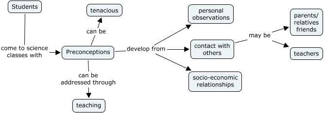 This Concept Map, created with IHMC CmapTools, has information related to: 1.4 - Discovery 1 - What do I know, Preconceptions can be addressed through teaching, Preconceptions develop from socio-economic relationships, Preconceptions develop from contact with others, contact with others may be parents/ relatives friends, contact with others may be teachers, Preconceptions can be tenacious, Students come to science classes with Preconceptions, Preconceptions develop from personal observations