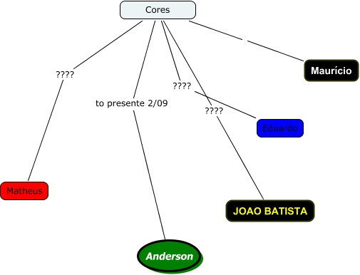 Esse mapa conceitual, produzido no IHMC CmapTools, tem a informação relacionada a: Cores do Grupo, Cores to presente 2/09 Anderson, Cores ???? Eduardo, Cores ???? Matheus, Cores ???? JOAO BATISTA