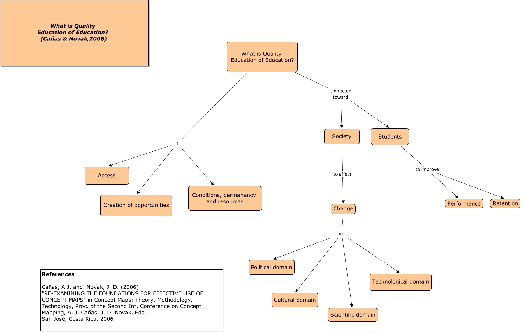 This Concept Map, created with IHMC CmapTools, has information related to: WhatisQualityEducationofEducation_Hierachical, Students to improve Performance, Students to improve Retention, What is Quality Education of Education? is Creation of opportunities, Change in Cultural domain, What is Quality Education of Education? is directed toward Students, What is Quality Education of Education? is Access, What is Quality Education of Education? is Conditions, permanancy and resources, Change in Scientific domain, What is Quality Education of Education? is directed toward Society, Change in Technological domain, Change in Political domain, Society to affect Change