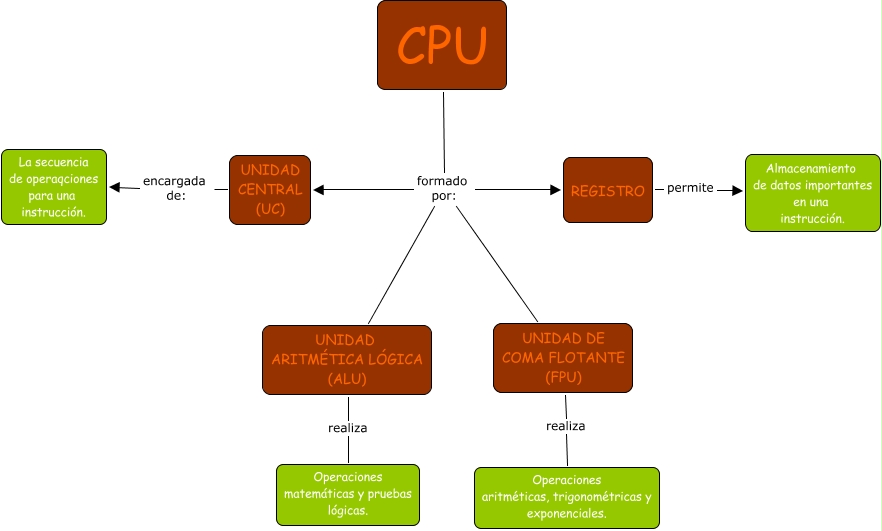 Este Cmap, tiene información relacionada con: CPU, CPU formado por: REGISTRO, UNIDAD ARITMÉTICA LÓGICA (ALU) realiza Operaciones matemáticas y pruebas lógicas., UNIDAD DE COMA FLOTANTE (FPU) realiza Operaciones aritméticas, trigonométricas y exponenciales., CPU formado por: UNIDAD CENTRAL (UC), REGISTRO permite Almacenamiento de datos importantes en una instrucción., CPU formado por: UNIDAD ARITMÉTICA LÓGICA (ALU), CPU formado por: UNIDAD DE COMA FLOTANTE (FPU), UNIDAD CENTRAL (UC) encargada de: La secuencia de operaqciones para una instrucción.