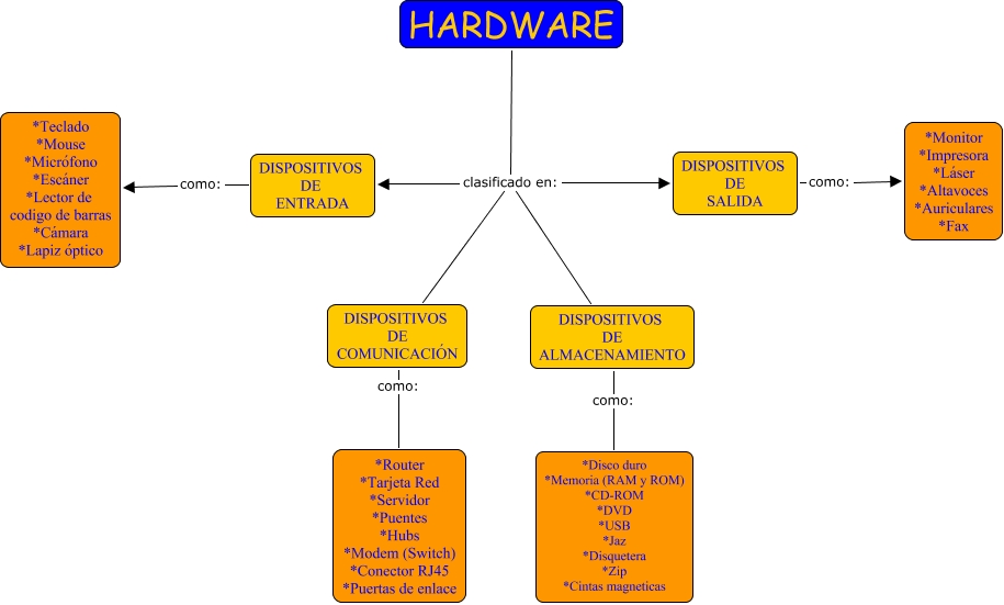 Este Cmap, tiene información relacionada con: HARDWARE, DISPOSITIVOS DE ALMACENAMIENTO como: *Disco duro *Memoria (RAM y ROM) *CD-ROM *DVD *USB *Jaz *Disquetera *Zip *Cintas magneticas, HARDWARE clasificado en: DISPOSITIVOS DE SALIDA, DISPOSITIVOS DE COMUNICACIÓN como: *Router *Tarjeta Red *Servidor *Puentes *Hubs *Modem (Switch) *Conector RJ45 *Puertas de enlace, DISPOSITIVOS DE SALIDA como: *Monitor *Impresora *Láser *Altavoces *Auriculares *Fax, HARDWARE clasificado en: DISPOSITIVOS DE COMUNICACIÓN, DISPOSITIVOS DE ENTRADA como: *Teclado *Mouse *Micrófono *Escáner *Lector de codigo de barras *Cámara *Lapiz óptico, HARDWARE clasificado en: DISPOSITIVOS DE ENTRADA, HARDWARE clasificado en: DISPOSITIVOS DE ALMACENAMIENTO