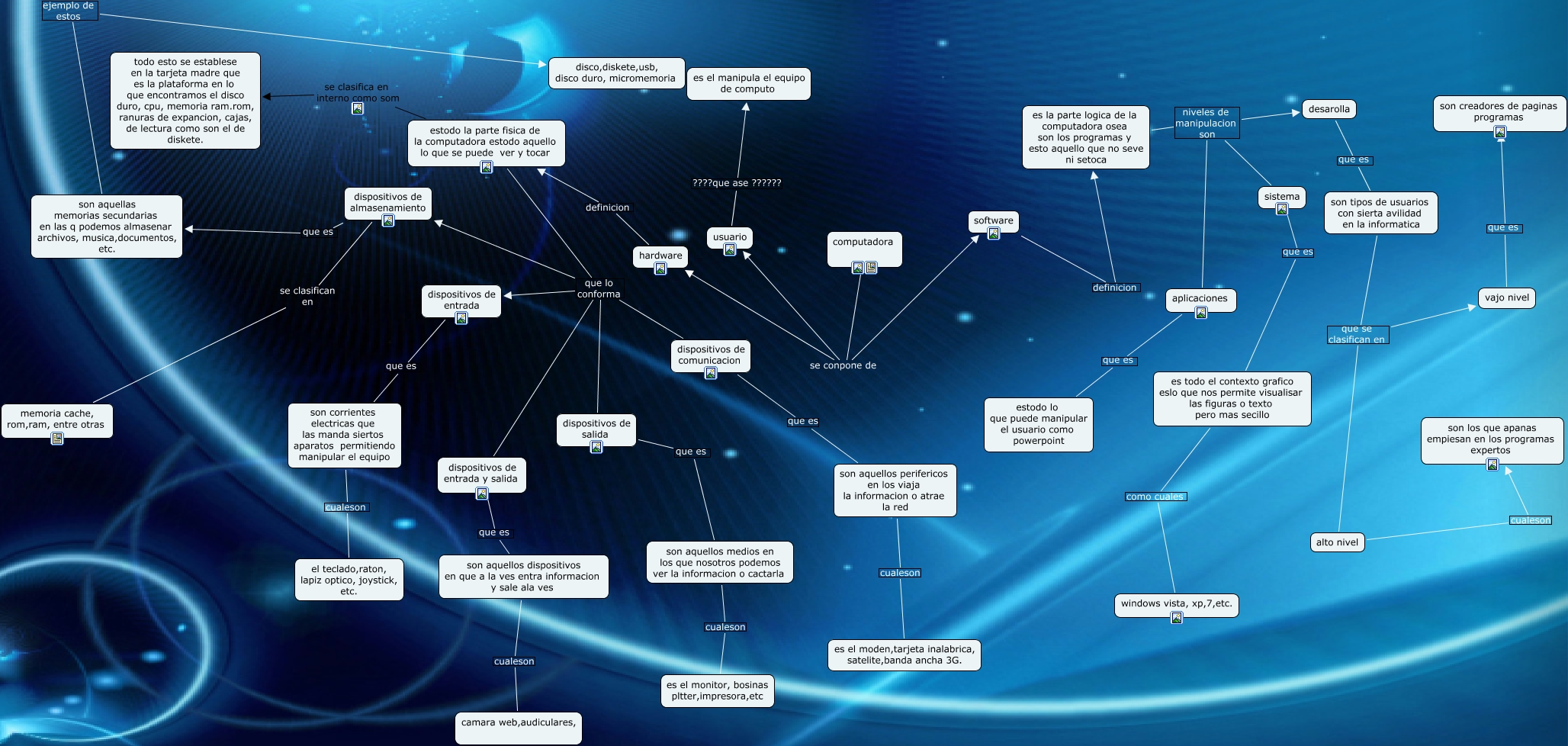 Este Cmap, tiene información relacionada con: Sin Título 3, dispositivos de entrada y salida que es son aquellos dispositivos en que a la ves entra informacion y sale ala ves, son aquellos dispositivos en que a la ves entra informacion y sale ala ves cualeson camara web,audiculares,, es la parte logica de la computadora osea son los programas y esto aquello que no seve ni setoca niveles de manipulacion son desarolla, estodo la parte fisica de la computadora estodo aquello lo que se puede ver y tocar que lo conforma dispositivos de entrada, son aquellos medios en los que nosotros podemos ver la informacion o cactarla cualeson es el monitor, bosinas pltter,impresora,etc, son aquellas memorias secundarias en las q podemos almasenar archivos, musica,documentos, etc. ejemplo de estos disco,diskete,usb, disco duro, micromemoria, vajo nivel que es son creadores de paginas programas, software definicion es la parte logica de la computadora osea son los programas y esto aquello que no seve ni setoca, aplicaciones que es estodo lo que puede manipular el usuario como powerpoint, estodo la parte fisica de la computadora estodo aquello lo que se puede ver y tocar se clasifica en interno como som todo esto se establese en la tarjeta madre que es la plataforma en lo que encontramos el disco duro, cpu, memoria ram.rom, ranuras de expancion, cajas, de lectura como son el de diskete., dispositivos de almasenamiento que es son aquellas memorias secundarias en las q podemos almasenar archivos, musica,documentos, etc., hardware definicion estodo la parte fisica de la computadora estodo aquello lo que se puede ver y tocar, usuario ????que ase ?????? es el manipula el equipo de computo, dispositivos de almasenamiento se clasifican en memoria cache, rom,ram, entre otras, son aquellos perifericos en los viaja la informacion o atrae la red cualeson es el moden,tarjeta inalabrica, satelite,banda ancha 3G., sistema que es es todo el contexto grafico eslo que nos permite visualisar las figuras o texto pero mas secillo, dispositivos de comunicacion que es son aquellos perifericos en los viaja la informacion o atrae la red, desarolla que es son tipos de usuarios con sierta avilidad en la informatica, estodo la parte fisica de la computadora estodo aquello lo que se puede ver y tocar que lo conforma dispositivos de salida, estodo la parte fisica de la computadora estodo aquello lo que se puede ver y tocar que lo conforma dispositivos de almasenamiento