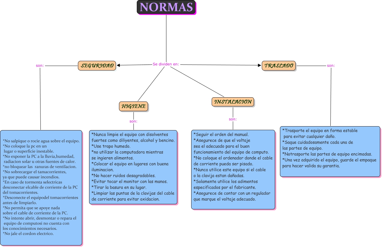 Este Cmap, tiene información relacionada con: NORMAS, NORMAS Se dividen en: TRASLADO, SEGURIDAD son: *No salpique o rocie agua sobre el equipo. *No coloque la pc en un lugar o superficie inestable. *No exponer la PC a la lluvia,humedad, radiacion solar u otras fuentes de calor. *no bloquear las ranuras de ventilacion. *No sobrecargar el tamacorrientes, ya que puede causar incendios. *En caso de tormenta selectricas desconectar elcable de corriente de la PC del tomacorrientes. *Desconecte el equipodel tomacorrientes antes de limpiarlo. *No permita que se apoye nada sobre el cable de corriente de la PC. *No intente abrir, desmontar o repara el equipo de computosi no cuenta con los conocimientos necesarios. *No jale el cordon electrico., HIGIENE son: *Nunca limpie el equipo con disolventes fuertes como diliyentes, alcohol y bencino. *Use trapo humedo. *no utilizar la computadora mientras se ingieren alimentos. *Colocar el equipo en lugares con buena iluminacion. *No hacer ruidos desagradables. *Evitar tocar el monitor con las manos. *Tirar la basura en su lugar. *Limpiar las puntas de la clavijas del cable de corriente para evitar oxidacion., NORMAS Se dividen en: INSTALACION, NORMAS Se dividen en: HIGIENE, INSTALACION son: *Seguir el orden del manual. *Asegurece de que el voltaje sea el adecuado para el buen funcionamiento del equipo de computo. *No coloque el ordenador donde el cable de corriente pueda ser pisado. *Nunca utilice este equipo si el cable o la clavija estan dañadas. *Solamente utilice los adimentos especificados por el fabricante. *Asegurece de contar con un regulador que marque el voltaje adecuado., TRASLADO son: *Trasporte el equipo en forma estable para evitar cualquier daño. *Saque cuidadosamente cada una de las partes de equipo. *Notrasporte las partes de equipo encimadas. *Una vez adquirido el equipo, guarde el empaque para hacer valida su garantia., NORMAS Se dividen en: SEGURIDAD