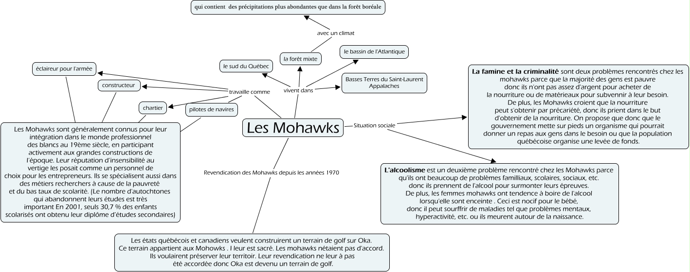 Cette carte conceptuelle, cree avec IHMC CmapTools, contient des informations liees a : Sans titre 1, Les Mohawks travaille comme constructeur, Les Mohawks travaille comme chartier, Les Mohawks vivent dans le bassin de l'Atlantique, Les Mohawks Revendication des Mohawks depuis les années 1970 Les états québécois et canadiens veulent construirent un terrain de golf sur Oka. Ce terrain appartient aux Mohowks . I leur est sacré. Les mohawks nétaient pas d'accord. Ils voulairent préserver leur territoir. Leur revendication ne leur à pas été accordée donc Oka est devenu un terrain de golf., Les Mohawks Situation sociale La famine et la criminalité sont deux problèmes rencontrés chez les mohawks parce que la majorité des gens est pauvre donc ils n'ont pas assez d'argent pour acheter de la nourriture ou de matérieaux pour subvennir à leur besoin. De plus, les Mohawks croient que la nourriture peut s'obtenir par précariété, donc ils prient dans le but d'obtenir de la nourriture. On propose que donc que le gouvernement mette sur pieds un organisme qui pourrait donner un repas aux gens dans le besoin ou que la population québécoise organise une levée de fonds., Les Mohawks travaille comme pilotes de navires, Les Mohawks vivent dans le sud du Québec, pilotes de navires ???? Les Mohawks sont généralement connus pour leur intégration dans le monde professionnel des blancs au 19ème siècle, en participant activement aux grandes constructions de l’époque. Leur réputation d’insensibilité au vertige les posait comme un personnel de choix pour les entrepreneurs. Ils se spécialisent aussi dans des métiers recherchers à cause de la pauvreté et du bas taux de scolarité. (Le nombre d'autochtones qui abandonnent leurs études est très important En 2001, seuls 30,7 % des enfants scolarisés ont obtenu leur diplôme d’études secondaires), Les Mohawks vivent dans la forêt mixte, constructeur ???? Les Mohawks sont généralement connus pour leur intégration dans le monde professionnel des blancs au 19ème siècle, en participant activement aux grandes constructions de l’époque. Leur réputation d’insensibilité au vertige les posait comme un personnel de choix pour les entrepreneurs. Ils se spécialisent aussi dans des métiers recherchers à cause de la pauvreté et du bas taux de scolarité. (Le nombre d'autochtones qui abandonnent leurs études est très important En 2001, seuls 30,7 % des enfants scolarisés ont obtenu leur diplôme d’études secondaires), chartier ???? Les Mohawks sont généralement connus pour leur intégration dans le monde professionnel des blancs au 19ème siècle, en participant activement aux grandes constructions de l’époque. Leur réputation d’insensibilité au vertige les posait comme un personnel de choix pour les entrepreneurs. Ils se spécialisent aussi dans des métiers recherchers à cause de la pauvreté et du bas taux de scolarité. (Le nombre d'autochtones qui abandonnent leurs études est très important En 2001, seuls 30,7 % des enfants scolarisés ont obtenu leur diplôme d’études secondaires), la forêt mixte avec un climat qui contient des précipitations plus abondantes que dans la forêt boréale, éclaireur pour l'armée ???? Les Mohawks sont généralement connus pour leur intégration dans le monde professionnel des blancs au 19ème siècle, en participant activement aux grandes constructions de l’époque. Leur réputation d’insensibilité au vertige les posait comme un personnel de choix pour les entrepreneurs. Ils se spécialisent aussi dans des métiers recherchers à cause de la pauvreté et du bas taux de scolarité. (Le nombre d'autochtones qui abandonnent leurs études est très important En 2001, seuls 30,7 % des enfants scolarisés ont obtenu leur diplôme d’études secondaires), Les Mohawks travaille comme éclaireur pour l'armée, Les Mohawks vivent dans Basses Terres du Saint-Laurent Appalaches, Les Mohawks Situation sociale L'alcoolisme est un deuxième problème rencontré chez les Mohawks parce qu'ils ont beaucoup de problèmes familliaux, scolaires, sociaux, etc. donc ils prennent de l'alcool pour surmonter leurs épreuves. De plus, les femmes mohawks ont tendence à boire de l'alcool lorsqu'elle sont enceinte . Ceci est nocif pour le bébé, donc il peut sourffrir de maladies tel que problèmes mentaux, hyperactivité, etc. ou ils meurent autour de la naissance.
