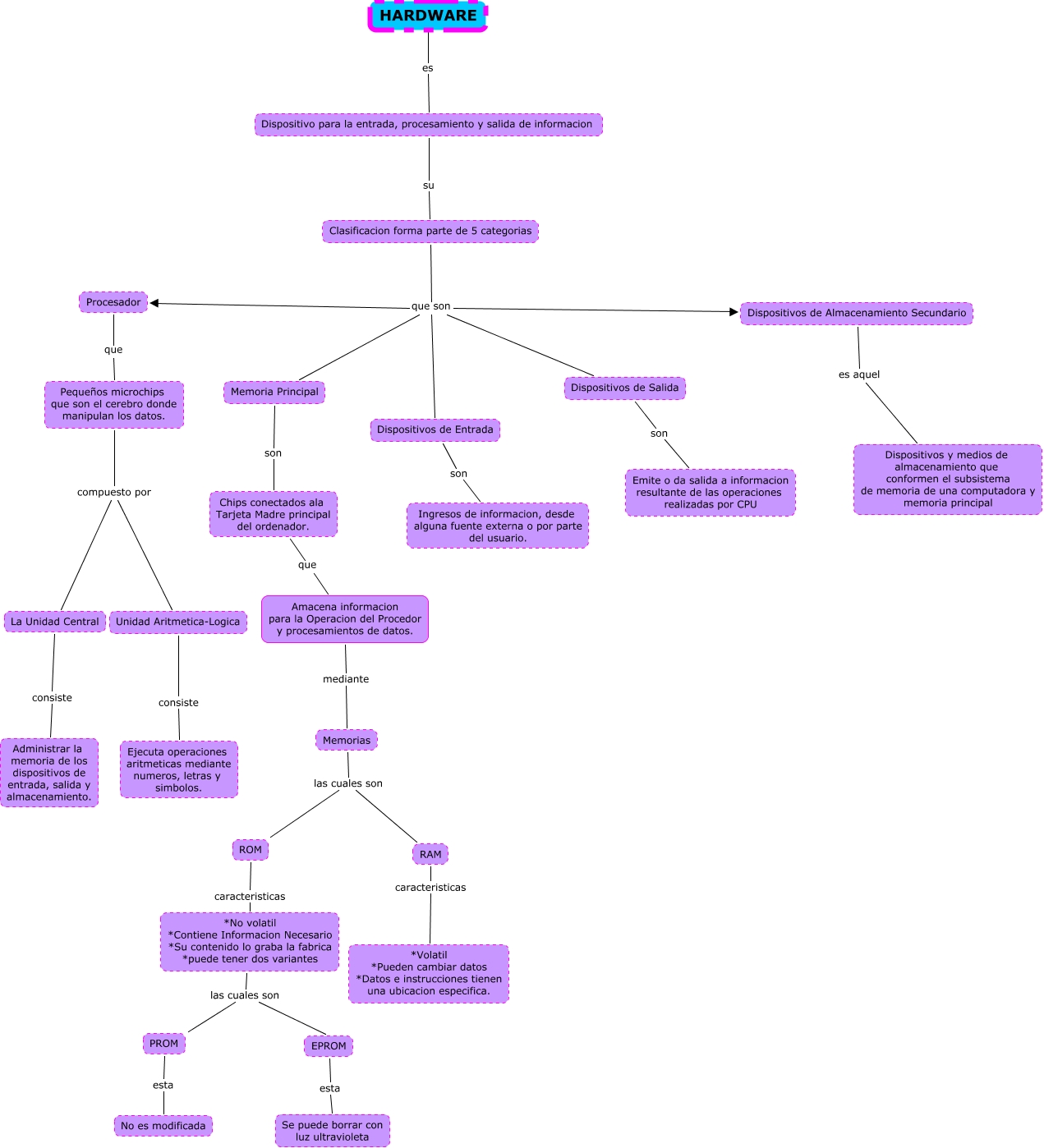 Este Cmap, tiene información relacionada con: Hardware, Chips conectados ala Tarjeta Madre principal del ordenador. que Amacena informacion para la Operacion del Procedor y procesamientos de datos., Dispositivos de Entrada son Ingresos de informacion, desde alguna fuente externa o por parte del usuario., Clasificacion forma parte de 5 categorias que son Dispositivos de Entrada, Dispositivos de Salida son Emite o da salida a informacion resultante de las operaciones realizadas por CPU, Clasificacion forma parte de 5 categorias que son Memoria Principal, Memorias las cuales son RAM, Clasificacion forma parte de 5 categorias que son Dispositivos de Salida, Memoria Principal son Chips conectados ala Tarjeta Madre principal del ordenador., Dispositivos de Almacenamiento Secundario es aquel Dispositivos y medios de almacenamiento que conformen el subsistema de memoria de una computadora y memoria principal, ROM caracteristicas *No volatil *Contiene Informacion Necesario *Su contenido lo graba la fabrica *puede tener dos variantes, Procesador que Pequeños microchips que son el cerebro donde manipulan los datos., Dispositivo para la entrada, procesamiento y salida de informacion su Clasificacion forma parte de 5 categorias, PROM esta No es modificada, La Unidad Central consiste Administrar la memoria de los dispositivos de entrada, salida y almacenamiento., Unidad Aritmetica-Logica consiste Ejecuta operaciones aritmeticas mediante numeros, letras y simbolos., *No volatil *Contiene Informacion Necesario *Su contenido lo graba la fabrica *puede tener dos variantes las cuales son PROM, Pequeños microchips que son el cerebro donde manipulan los datos. compuesto por La Unidad Central, EPROM esta Se puede borrar con luz ultravioleta, Memorias las cuales son ROM, RAM caracteristicas *Volatil *Pueden cambiar datos *Datos e instrucciones tienen una ubicacion especifica.
