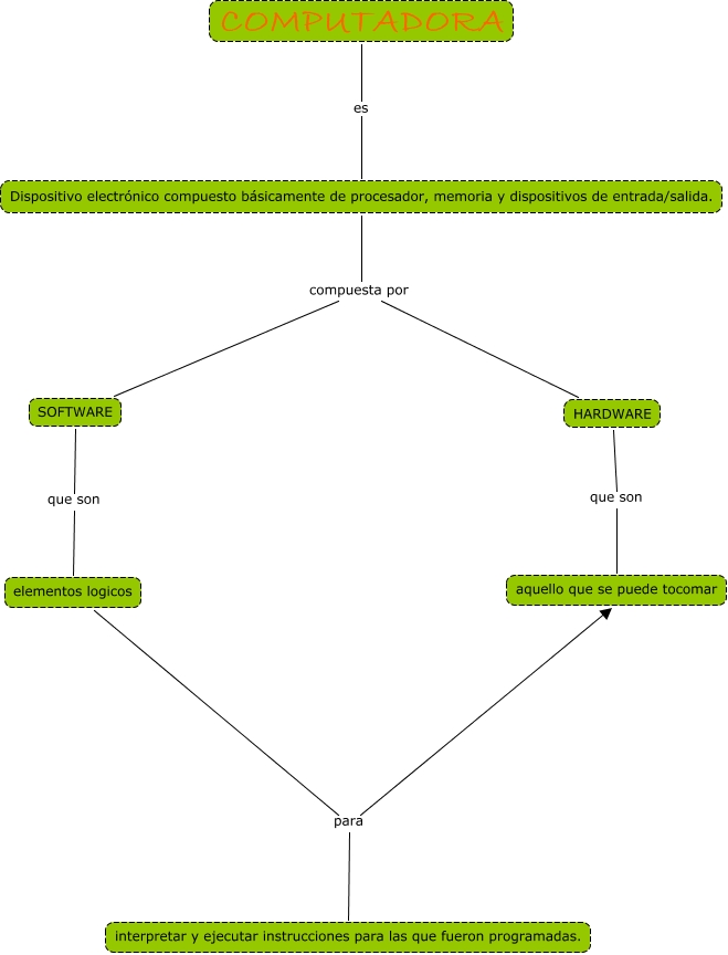 Este Cmap, tiene información relacionada con: Computadora, HARDWARE que son aquello que se puede tocomar, elementos logicos para aquello que se puede tocomar, Dispositivo electrónico compuesto básicamente de procesador, memoria y dispositivos de entrada/salida. compuesta por HARDWARE, COMPUTADORA es Dispositivo electrónico compuesto básicamente de procesador, memoria y dispositivos de entrada/salida., SOFTWARE que son elementos logicos, elementos logicos para interpretar y ejecutar instrucciones para las que fueron programadas., Dispositivo electrónico compuesto básicamente de procesador, memoria y dispositivos de entrada/salida. compuesta por SOFTWARE