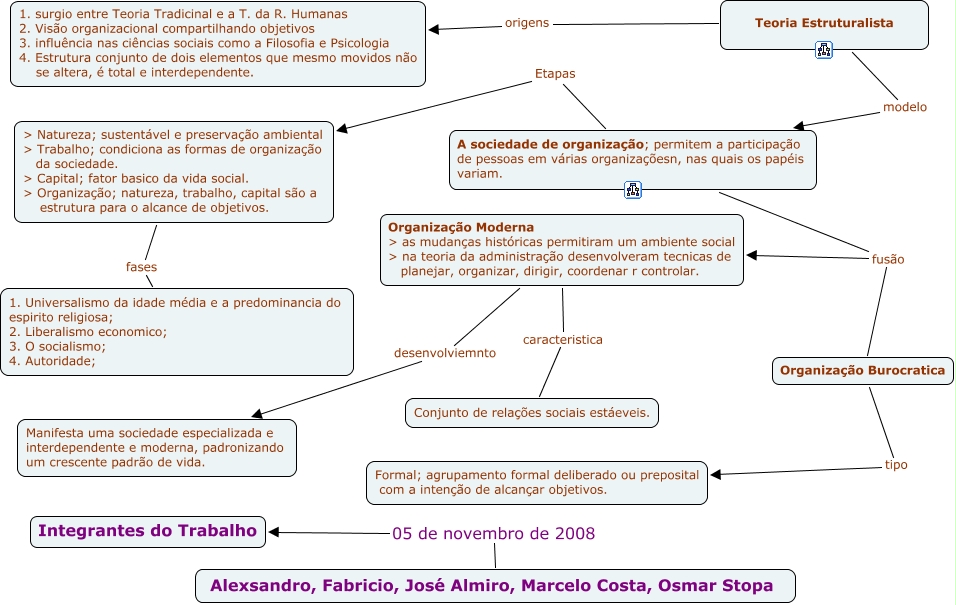 Este Cmap, tiene información relacionada con: Teoria Estruturalista_irma, A sociedade de organização; permitem a participação de pessoas em várias organizaçõesn, nas quais os papéis variam. Etapas > Natureza; sustentável e preservação ambiental > Trabalho; condiciona as formas de organização da sociedade. > Capital; fator basico da vida social. > Organização; natureza, trabalho, capital são a estrutura para o alcance de objetivos., A sociedade de organização; permitem a participação de pessoas em várias organizaçõesn, nas quais os papéis variam. fusão Organização Burocratica, Alexsandro, Fabricio, José Almiro, Marcelo Costa, Osmar Stopa 05 de novembro de 2008 Integrantes do Trabalho, Teoria Estruturalista origens 1. surgio entre Teoria Tradicinal e a T. da R. Humanas 2. Visão organizacional compartilhando objetivos 3. influência nas ciências sociais como a Filosofia e Psicologia 4. Estrutura conjunto de dois elementos que mesmo movidos não se altera, é total e interdependente., Teoria Estruturalista modelo A sociedade de organização; permitem a participação de pessoas em várias organizaçõesn, nas quais os papéis variam., > Natureza; sustentável e preservação ambiental > Trabalho; condiciona as formas de organização da sociedade. > Capital; fator basico da vida social. > Organização; natureza, trabalho, capital são a estrutura para o alcance de objetivos. fases 1. Universalismo da idade média e a predominancia do espirito religiosa; 2. Liberalismo economico; 3. O socialismo; 4. Autoridade;, A sociedade de organização; permitem a participação de pessoas em várias organizaçõesn, nas quais os papéis variam. fusão Organização Moderna > as mudanças históricas permitiram um ambiente social > na teoria da administração desenvolveram tecnicas de planejar, organizar, dirigir, coordenar r controlar., Organização Moderna > as mudanças históricas permitiram um ambiente social > na teoria da administração desenvolveram tecnicas de planejar, organizar, dirigir, coordenar r controlar. desenvolviemnto Manifesta uma sociedade especializada e interdependente e moderna, padronizando um crescente padrão de vida., Organização Moderna > as mudanças históricas permitiram um ambiente social > na teoria da administração desenvolveram tecnicas de planejar, organizar, dirigir, coordenar r controlar. caracteristica Conjunto de relações sociais estáeveis., Organização Burocratica tipo Formal; agrupamento formal deliberado ou preposital com a intenção de alcançar objetivos.
