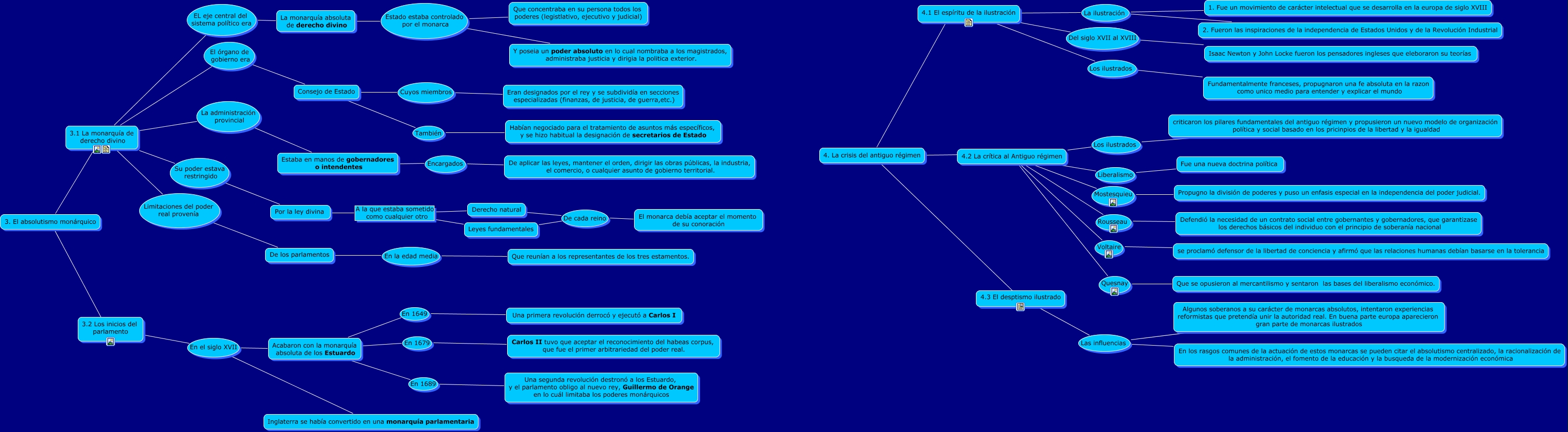 Este Cmap, tiene información relacionada con: Antiguo regimen punto 3 y 4, 4.1 El espíritu de la ilustración Los ilustrados Fundamentalmente franceses, propugnaron una fe absoluta en la razon como unico medio para entender y explicar el mundo, 4.2 La crítica al Antiguo régimen Liberalismo Fue una nueva doctrina política, 4.1 El espíritu de la ilustración Del siglo XVII al XVIII Isaac Newton y John Locke fueron los pensadores ingleses que eleboraron su teorías, Acabaron con la monarquía absoluta de los Estuardo En 1689 Una segunda revolución destronó a los Estuardo, y el parlamento obligo al nuevo rey, Guillermo de Orange en lo cuál limitaba los poderes monárquicos, Estaba en manos de gobernadores o intendentes Encargados De aplicar las leyes, mantener el orden, dirigir las obras públicas, la industria, el comercio, o cualquier asunto de gobierno territorial., 3.1 La monarquía de derecho divino El órgano de gobierno era Consejo de Estado, 4.2 La crítica al Antiguo régimen Los ilustrados criticaron los pilares fundamentales del antiguo régimen y propusieron un nuevo modelo de organización política y social basado en los pricinpios de la libertad y la igualdad, Acabaron con la monarquía absoluta de los Estuardo En 1679 Carlos II tuvo que aceptar el reconocimiento del habeas corpus, que fue el primer arbitrariedad del poder real., 3. El absolutismo monárquico ???? 3.1 La monarquía de derecho divino, 3.1 La monarquía de derecho divino La administración provincial Estaba en manos de gobernadores o intendentes, 4.3 El desptismo ilustrado Las influencias En los rasgos comunes de la actuación de estos monarcas se pueden citar el absolutismo centralizado, la racionalización de la administración, el fomento de la educación y la busqueda de la modernización económica, 4. La crisis del antiguo régimen ???? 4.3 El desptismo ilustrado, 4.1 El espíritu de la ilustración La ilustración 2. Fueron las inspiraciones de la independencia de Estados Unidos y de la Revolución Industrial, Consejo de Estado Cuyos miembros Eran designados por el rey y se subdividía en secciones especializadas (finanzas, de justicia, de guerra,etc.), 3.1 La monarquía de derecho divino Limitaciones del poder real provenía De los parlamentos, 4.2 La crítica al Antiguo régimen Voltaire se proclamó defensor de la libertad de conciencia y afirmó que las relaciones humanas debían basarse en la tolerancia, 4.3 El desptismo ilustrado Las influencias Algunos soberanos a su carácter de monarcas absolutos, intentaron experiencias reformistas que pretendía unir la autoridad real. En buena parte europa aparecieron gran parte de monarcas ilustrados, 4.1 El espíritu de la ilustración La ilustración 1. Fue un movimiento de carácter intelectual que se desarrolla en la europa de siglo XVIII, 4.2 La crítica al Antiguo régimen Rousseau Defendió la necesidad de un contrato social entre gobernantes y gobernadores, que garantizase los derechos básicos del individuo con el principio de soberanía nacional, 4.2 La crítica al Antiguo régimen Quesnay Que se opusieron al mercantilismo y sentaron las bases del liberalismo económico.