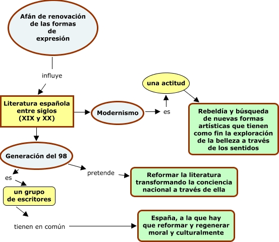 Este Cmap, tiene información relacionada con: literat_veinte, Literatura española entre siglos (XIX y XX) ???? Modernismo, Generación del 98 es un grupo de escritores, Generación del 98 pretende Reformar la literatura transformando la conciencia nacional a través de ella, un grupo de escritores tienen en común España, a la que hay que reformar y regenerar moral y culturalmente, una actitud ???? Rebeldía y búsqueda de nuevas formas artísticas que tienen como fin la exploración de la belleza a través de los sentidos, Literatura española entre siglos (XIX y XX) ???? Generación del 98, Modernismo es una actitud, Afán de renovación de las formas de expresión influye Literatura española entre siglos (XIX y XX)