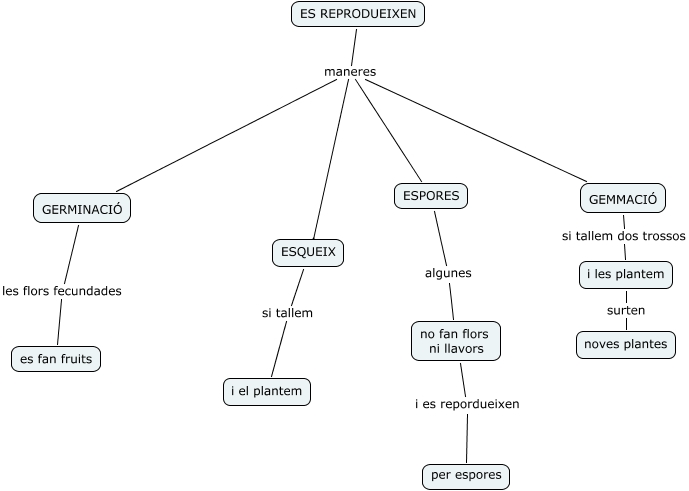 Este Cmap, tiene información relacionada con: es reprodueixen, i les plantem surten noves plantes, no fan flors ni llavors i es repordueixen per espores, ESPORES algunes no fan flors ni llavors, ES REPRODUEIXEN maneres ESPORES, ES REPRODUEIXEN maneres GERMINACIÓ, ES REPRODUEIXEN maneres GEMMACIÓ, ES REPRODUEIXEN maneres ESQUEIX, ESQUEIX si tallem i el plantem, GEMMACIÓ si tallem dos trossos i les plantem, GERMINACIÓ les flors fecundades es fan fruits