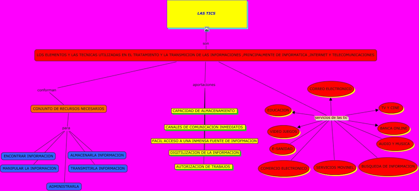 Este Cmap, tiene información relacionada con: las tics, CONJUNTO DE RECURSOS NECESARIOS para ALMACENARLA INFORMACION, CONJUNTO DE RECURSOS NECESARIOS para ENCONTRAR INFORMACION, LOS ELEMENTOS Y LAS TECNICAS UTILIZADAS EN EL TRATAMIENTO Y LA TRANSMICION DE LAS INFORMACIONES ,PRINCIPALMENTE DE INFORMATICA ,INTERNET Y TELECOMUNICACIONES servicios de las tic TV Y CINE, LOS ELEMENTOS Y LAS TECNICAS UTILIZADAS EN EL TRATAMIENTO Y LA TRANSMICION DE LAS INFORMACIONES ,PRINCIPALMENTE DE INFORMATICA ,INTERNET Y TELECOMUNICACIONES servicios de las tic EDUCACION, LOS ELEMENTOS Y LAS TECNICAS UTILIZADAS EN EL TRATAMIENTO Y LA TRANSMICION DE LAS INFORMACIONES ,PRINCIPALMENTE DE INFORMATICA ,INTERNET Y TELECOMUNICACIONES aportaciones AUTORIZACION DE TRABAJOS, LOS ELEMENTOS Y LAS TECNICAS UTILIZADAS EN EL TRATAMIENTO Y LA TRANSMICION DE LAS INFORMACIONES ,PRINCIPALMENTE DE INFORMATICA ,INTERNET Y TELECOMUNICACIONES servicios de las tic SERVICIOS MOVINEL, LOS ELEMENTOS Y LAS TECNICAS UTILIZADAS EN EL TRATAMIENTO Y LA TRANSMICION DE LAS INFORMACIONES ,PRINCIPALMENTE DE INFORMATICA ,INTERNET Y TELECOMUNICACIONES aportaciones CANALES DE COMUNICACION INMEDIATOS, CONJUNTO DE RECURSOS NECESARIOS para TRANSMITIRLA INFORMACION, LOS ELEMENTOS Y LAS TECNICAS UTILIZADAS EN EL TRATAMIENTO Y LA TRANSMICION DE LAS INFORMACIONES ,PRINCIPALMENTE DE INFORMATICA ,INTERNET Y TELECOMUNICACIONES son LAS TICS, LOS ELEMENTOS Y LAS TECNICAS UTILIZADAS EN EL TRATAMIENTO Y LA TRANSMICION DE LAS INFORMACIONES ,PRINCIPALMENTE DE INFORMATICA ,INTERNET Y TELECOMUNICACIONES aportaciones FACIL ACCESO A UNA INMENSA FUENTE DE INFOFMACION, LOS ELEMENTOS Y LAS TECNICAS UTILIZADAS EN EL TRATAMIENTO Y LA TRANSMICION DE LAS INFORMACIONES ,PRINCIPALMENTE DE INFORMATICA ,INTERNET Y TELECOMUNICACIONES servicios de las tic E-SANIDAD, LOS ELEMENTOS Y LAS TECNICAS UTILIZADAS EN EL TRATAMIENTO Y LA TRANSMICION DE LAS INFORMACIONES ,PRINCIPALMENTE DE INFORMATICA ,INTERNET Y TELECOMUNICACIONES servicios de las tic COMERCIO ELECTRONICO, LOS ELEMENTOS Y LAS TECNICAS UTILIZADAS EN EL TRATAMIENTO Y LA TRANSMICION DE LAS INFORMACIONES ,PRINCIPALMENTE DE INFORMATICA ,INTERNET Y TELECOMUNICACIONES servicios de las tic AUDIO Y MUSICA, CONJUNTO DE RECURSOS NECESARIOS para MANIPULAR LA INFORMACION, LOS ELEMENTOS Y LAS TECNICAS UTILIZADAS EN EL TRATAMIENTO Y LA TRANSMICION DE LAS INFORMACIONES ,PRINCIPALMENTE DE INFORMATICA ,INTERNET Y TELECOMUNICACIONES servicios de las tic BANCA ONLINE, CONJUNTO DE RECURSOS NECESARIOS para ADMINISTRARLA, LOS ELEMENTOS Y LAS TECNICAS UTILIZADAS EN EL TRATAMIENTO Y LA TRANSMICION DE LAS INFORMACIONES ,PRINCIPALMENTE DE INFORMATICA ,INTERNET Y TELECOMUNICACIONES aportaciones CAPACIDAD DE ALMACENAMIENTO, LOS ELEMENTOS Y LAS TECNICAS UTILIZADAS EN EL TRATAMIENTO Y LA TRANSMICION DE LAS INFORMACIONES ,PRINCIPALMENTE DE INFORMATICA ,INTERNET Y TELECOMUNICACIONES servicios de las tic VIDEO JUEGOS, LOS ELEMENTOS Y LAS TECNICAS UTILIZADAS EN EL TRATAMIENTO Y LA TRANSMICION DE LAS INFORMACIONES ,PRINCIPALMENTE DE INFORMATICA ,INTERNET Y TELECOMUNICACIONES servicios de las tic BUSQUEDA DE INFORMACION, LOS ELEMENTOS Y LAS TECNICAS UTILIZADAS EN EL TRATAMIENTO Y LA TRANSMICION DE LAS INFORMACIONES ,PRINCIPALMENTE DE INFORMATICA ,INTERNET Y TELECOMUNICACIONES aportaciones DIGITILIZACION DE LA INFORMACION