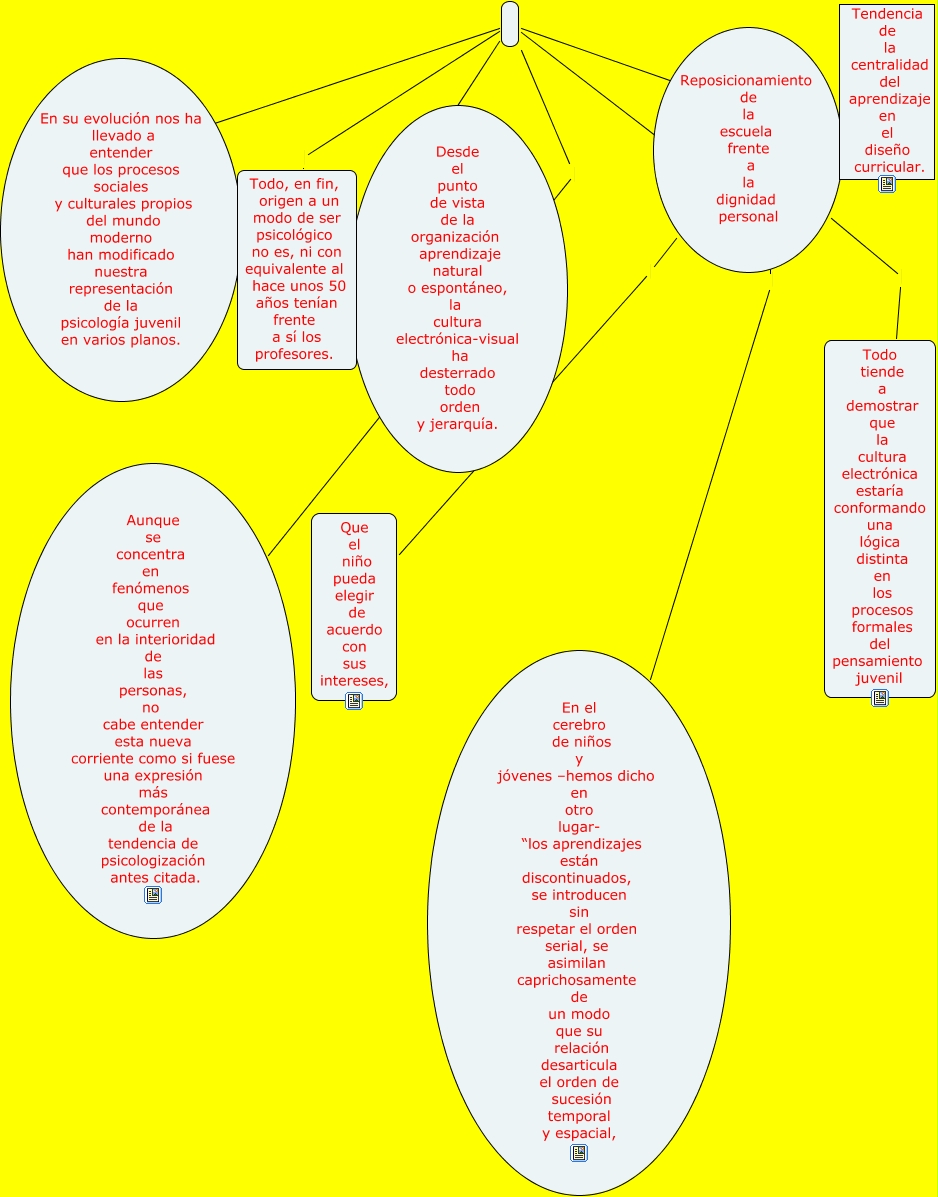 Este Cmap, tiene información relacionada con: PSICOLOGIZACION DEL CURRICULO, Tendencia de la centralidad del aprendizaje en el diseño curricular., Reposicionamiento de la escuela frente a la dignidad personal En el cerebro de niños y jóvenes –hemos dicho en otro lugar- “los aprendizajes están discontinuados, se introducen sin respetar el orden serial, se asimilan caprichosamente de un modo que su relación desarticula el orden de sucesión temporal y espacial,, Desde el punto de vista de la organización aprendizaje natural o espontáneo, la cultura electrónica-visual ha desterrado todo orden y jerarquía., Reposicionamiento de la escuela frente a la dignidad personal, Reposicionamiento de la escuela frente a la dignidad personal Todo tiende a demostrar que la cultura electrónica estaría conformando una lógica distinta en los procesos formales del pensamiento juvenil, Todo, en fin, origen a un modo de ser psicológico no es, ni con equivalente al hace unos 50 años tenían frente a sí los profesores., En su evolución nos ha llevado a entender que los procesos sociales y culturales propios del mundo moderno han modificado nuestra representación de la psicología juvenil en varios planos., Reposicionamiento de la escuela frente a la dignidad personal Que el niño pueda elegir de acuerdo con sus intereses,, Aunque se concentra en fenómenos que ocurren en la interioridad de las personas, no cabe entender esta nueva corriente como si fuese una expresión más contemporánea de la tendencia de psicologización antes citada.