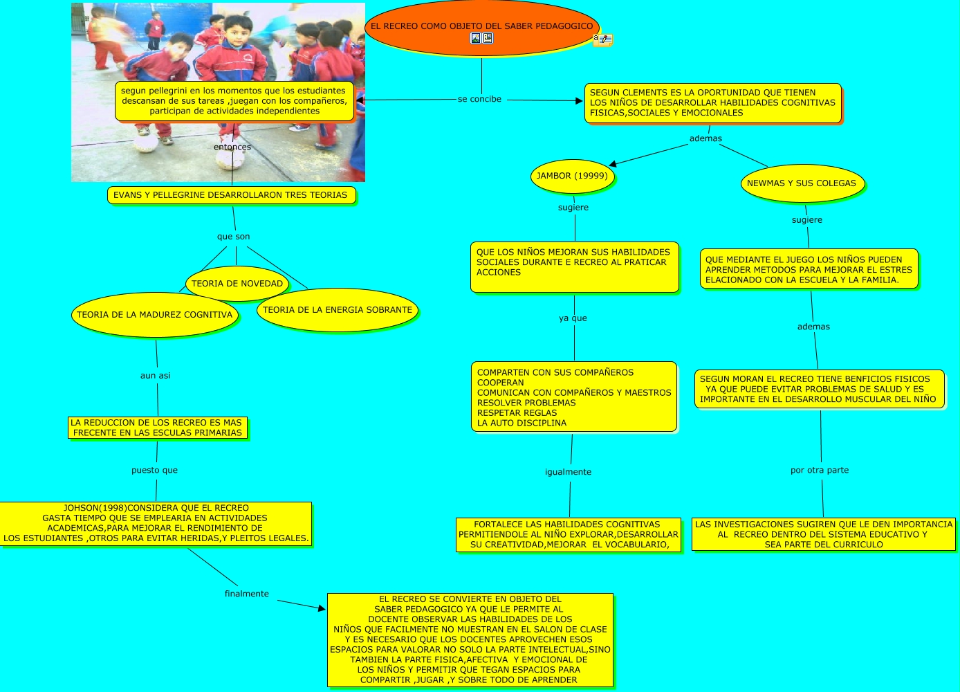 Este Cmap, tiene información relacionada con: Sin Título 1, LA REDUCCION DE LOS RECREO ES MAS FRECENTE EN LAS ESCULAS PRIMARIAS puesto que JOHSON(1998)CONSIDERA QUE EL RECREO GASTA TIEMPO QUE SE EMPLEARIA EN ACTIVIDADES ACADEMICAS,PARA MEJORAR EL RENDIMIENTO DE LOS ESTUDIANTES ,OTROS PARA EVITAR HERIDAS,Y PLEITOS LEGALES., SEGUN CLEMENTS ES LA OPORTUNIDAD QUE TIENEN LOS NIÑOS DE DESARROLLAR HABILIDADES COGNITIVAS FISICAS,SOCIALES Y EMOCIONALES ademas JAMBOR (19999), segun pellegrini en los momentos que los estudiantes descansan de sus tareas ,juegan con los compañeros, participan de actividades independientes entonces EVANS Y PELLEGRINE DESARROLLARON TRES TEORIAS, JOHSON(1998)CONSIDERA QUE EL RECREO GASTA TIEMPO QUE SE EMPLEARIA EN ACTIVIDADES ACADEMICAS,PARA MEJORAR EL RENDIMIENTO DE LOS ESTUDIANTES ,OTROS PARA EVITAR HERIDAS,Y PLEITOS LEGALES. finalmente EL RECREO SE CONVIERTE EN OBJETO DEL SABER PEDAGOGICO YA QUE LE PERMITE AL DOCENTE OBSERVAR LAS HABILIDADES DE LOS NIÑOS QUE FACILMENTE NO MUESTRAN EN EL SALON DE CLASE Y ES NECESARIO QUE LOS DOCENTES APROVECHEN ESOS ESPACIOS PARA VALORAR NO SOLO LA PARTE INTELECTUAL,SINO TAMBIEN LA PARTE FISICA,AFECTIVA Y EMOCIONAL DE LOS NIÑOS Y PERMITIR QUE TEGAN ESPACIOS PARA COMPARTIR ,JUGAR ,Y SOBRE TODO DE APRENDER, SEGUN MORAN EL RECREO TIENE BENFICIOS FISICOS YA QUE PUEDE EVITAR PROBLEMAS DE SALUD Y ES IMPORTANTE EN EL DESARROLLO MUSCULAR DEL NIÑO por otra parte LAS INVESTIGACIONES SUGIREN QUE LE DEN IMPORTANCIA AL RECREO DENTRO DEL SISTEMA EDUCATIVO Y SEA PARTE DEL CURRICULO, EL RECREO COMO OBJETO DEL SABER PEDAGOGICO se concibe segun pellegrini en los momentos que los estudiantes descansan de sus tareas ,juegan con los compañeros, participan de actividades independientes, TEORIA DE LA MADUREZ COGNITIVA aun asi LA REDUCCION DE LOS RECREO ES MAS FRECENTE EN LAS ESCULAS PRIMARIAS, EVANS Y PELLEGRINE DESARROLLARON TRES TEORIAS que son TEORIA DE LA MADUREZ COGNITIVA, EVANS Y PELLEGRINE DESARROLLARON TRES TEORIAS que son TEORIA DE LA ENERGIA SOBRANTE, COMPARTEN CON SUS COMPAÑEROS COOPERAN COMUNICAN CON COMPAÑEROS Y MAESTROS RESOLVER PROBLEMAS RESPETAR REGLAS LA AUTO DISCIPLINA igualmente FORTALECE LAS HABILIDADES COGNITIVAS PERMITIENDOLE AL NIÑO EXPLORAR,DESARROLLAR SU CREATIVIDAD,MEJORAR EL VOCABULARIO,, QUE LOS NIÑOS MEJORAN SUS HABILIDADES SOCIALES DURANTE E RECREO AL PRATICAR ACCIONES ya que COMPARTEN CON SUS COMPAÑEROS COOPERAN COMUNICAN CON COMPAÑEROS Y MAESTROS RESOLVER PROBLEMAS RESPETAR REGLAS LA AUTO DISCIPLINA, EVANS Y PELLEGRINE DESARROLLARON TRES TEORIAS que son TEORIA DE NOVEDAD, EL RECREO COMO OBJETO DEL SABER PEDAGOGICO se concibe SEGUN CLEMENTS ES LA OPORTUNIDAD QUE TIENEN LOS NIÑOS DE DESARROLLAR HABILIDADES COGNITIVAS FISICAS,SOCIALES Y EMOCIONALES, NEWMAS Y SUS COLEGAS sugiere QUE MEDIANTE EL JUEGO LOS NIÑOS PUEDEN APRENDER METODOS PARA MEJORAR EL ESTRES ELACIONADO CON LA ESCUELA Y LA FAMILIA., JAMBOR (19999) sugiere QUE LOS NIÑOS MEJORAN SUS HABILIDADES SOCIALES DURANTE E RECREO AL PRATICAR ACCIONES, SEGUN CLEMENTS ES LA OPORTUNIDAD QUE TIENEN LOS NIÑOS DE DESARROLLAR HABILIDADES COGNITIVAS FISICAS,SOCIALES Y EMOCIONALES ademas NEWMAS Y SUS COLEGAS, QUE MEDIANTE EL JUEGO LOS NIÑOS PUEDEN APRENDER METODOS PARA MEJORAR EL ESTRES ELACIONADO CON LA ESCUELA Y LA FAMILIA. ademas SEGUN MORAN EL RECREO TIENE BENFICIOS FISICOS YA QUE PUEDE EVITAR PROBLEMAS DE SALUD Y ES IMPORTANTE EN EL DESARROLLO MUSCULAR DEL NIÑO