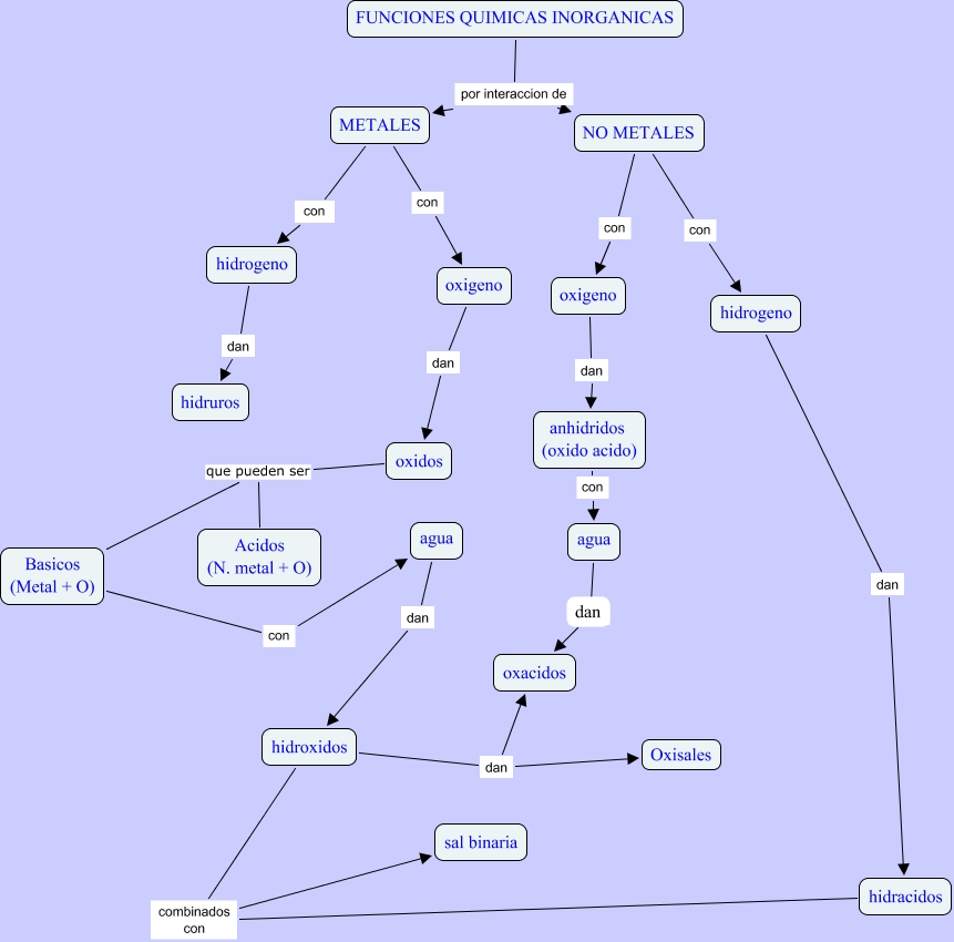 Este Cmap, tiene información relacionada con: Funciones Quimicas Inorganicas, agua ???? dan, hidroxidos dan Oxisales, hidroxidos combinados con sal binaria, hidrogeno dan hidracidos, hidroxidos dan oxacidos, hidracidos combinados con sal binaria, oxigeno dan oxidos, oxidos que pueden ser Basicos (Metal + O), NO METALES con hidrogeno, oxidos que pueden ser Acidos (N. metal + O), Basicos (Metal + O) con agua, FUNCIONES QUIMICAS INORGANICAS por interaccion de NO METALES, FUNCIONES QUIMICAS INORGANICAS por interaccion de METALES, METALES con hidrogeno, oxigeno dan anhidridos (oxido acido), hidrogeno dan hidruros, anhidridos (oxido acido) con agua, agua dan hidroxidos, NO METALES con oxigeno, METALES con oxigeno