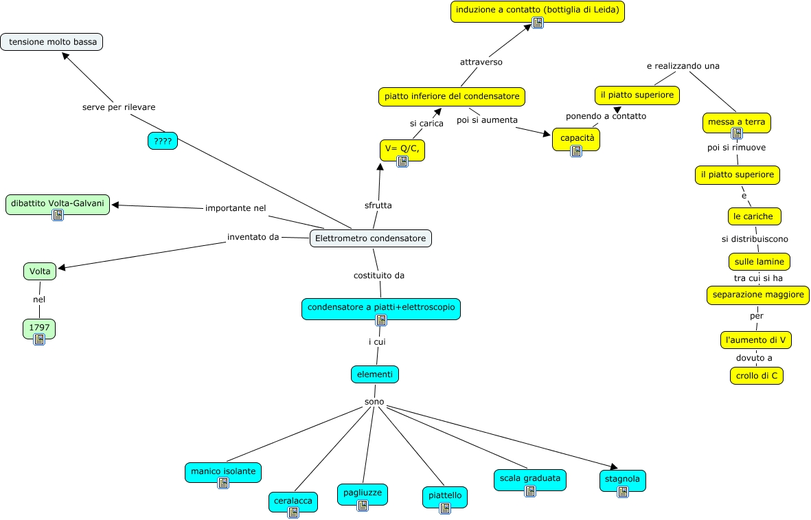 Questa Cmap, creata con IHMC CmapTools, contiene informazioni relative a: Mappa_Marco_R, il piatto superiore e le cariche, V= Q/C, si carica piatto inferiore del condensatore, Elettrometro condensatore costituito da condensatore a piatti+elettroscopio, l'aumento di V dovuto a crollo di C, elementi sono manico isolante, elementi sono piattello, piatto inferiore del condensatore attraverso induzione a contatto (bottiglia di Leida), elementi sono scala graduata, Elettrometro condensatore sfrutta V= Q/C,, Elettrometro condensatore serve per rilevare tensione molto bassa, Elettrometro condensatore inventato da Volta, le cariche si distribuiscono sulle lamine, elementi sono pagliuzze, capacità ponendo a contatto il piatto superiore, separazione maggiore per l'aumento di V, condensatore a piatti+elettroscopio i cui elementi, Elettrometro condensatore importante nel dibattito Volta-Galvani, Volta nel 1797, messa a terra poi si rimuove il piatto superiore, elementi sono stagnola