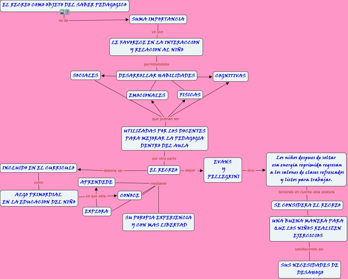 Este Cmap, tiene información relacionada con: EL RECREO COMO OBJETO DEL SABER PEDAGOFICO, APRENDEDE mediante SU POROPIA EXPERIENCIA Y CON MAS LIBERTAD, SOCIALES que podrian ser COGNITIVAS, EL RECREO COMO OBJETO DEL SABER PEDAGOGICO es de SUMA IMPORTANCIA, UTILIZADAS POR LOS DOCENTES PARA MEJORAR LA PEDAGOGIA DENTRO DEL AULA por otra parte EL RECREO, SOCIALES que podrian ser UTILIZADAS POR LOS DOCENTES PARA MEJORAR LA PEDAGOGIA DENTRO DEL AULA, DESARROLLAR HABILIDADES ???? EMOCIONALES, DESARROLLAR HABILIDADES ???? SOCIALES, SOCIALES que podrian ser FISICAS, EL RECREO segun EVANS Y PELLEGRINI, SOCIALES que podrian ser EMOCIONALES, ALGO PRIMORDIAL EN LA EDUCACION DEL NIÑO ya que este EXPLORA, SUMA IMPORTANCIA ya que LE FAVORECE EN LA INTERACCION Y RELACION AL NIÑO, UNA BUENA MANERA PARA QUE LOS NIÑOS REALIZEN EJERCICIOS satisfaciendo asi SUS NECESIDADES DE DESAHOGO, EVANS Y PELLEGRINI dice Los niños despues de soltar esa energia reprimida regresan a los salones de clases refrescados y listos para trabajar., INCLUIDO EN EL CURRICULO como ALGO PRIMORDIAL EN LA EDUCACION DEL NIÑO, SE CONSIDERA EL RECREO como UNA BUENA MANERA PARA QUE LOS NIÑOS REALIZEN EJERCICIOS, ALGO PRIMORDIAL EN LA EDUCACION DEL NIÑO ya que este APRENDEDE, ALGO PRIMORDIAL EN LA EDUCACION DEL NIÑO ya que este CONOCE, Los niños despues de soltar esa energia reprimida regresan a los salones de clases refrescados y listos para trabajar. teniendo en cuenta esta postura SE CONSIDERA EL RECREO, APRENDEDE mediante CONOCE