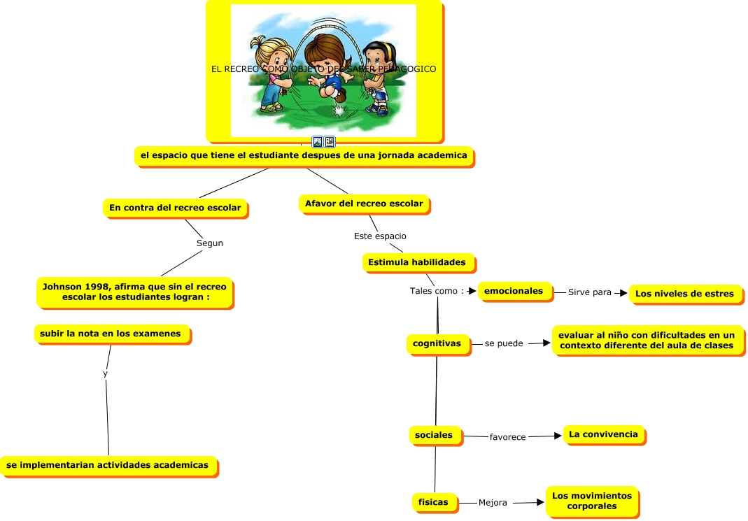 Este Cmap, tiene información relacionada con: el recreo como objeto del saber pedagogico, subir la nota en los examenes y se implementarian actividades academicas, En contra del recreo escolar Segun Johnson 1998, afirma que sin el recreo escolar los estudiantes logran :, emocionales Sirve para Los niveles de estres, Estimula habilidades Tales como : emocionales, fisicas Mejora Los movimientos corporales, cognitivas se puede evaluar al niño con dificultades en un contexto diferente del aula de clases, el espacio que tiene el estudiante despues de una jornada academica En esta se encuentran dos enfoques como son : En contra del recreo escolar, el espacio que tiene el estudiante despues de una jornada academica En esta se encuentran dos enfoques como son : Afavor del recreo escolar, Afavor del recreo escolar Este espacio Estimula habilidades, Estimula habilidades Tales como : fisicas, EL RECREO COMO OBJETO DEL SABER PEDAGOGICO Es el espacio que tiene el estudiante despues de una jornada academica, sociales favorece La convivencia, Estimula habilidades Tales como : cognitivas, Estimula habilidades Tales como : sociales
