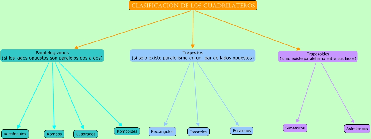 Este Cmap, tiene información relacionada con: Cuadriláteros, cLASIFICACIÓN DE LOS CUADRILÁTEROS Trapecios (si solo existe paralelismo en un par de lados opuestos) Isósceles, cLASIFICACIÓN DE LOS CUADRILÁTEROS Trapezoides (si no existe paralelismo entre sus lados) Simétricos, cLASIFICACIÓN DE LOS CUADRILÁTEROS Trapezoides (si no existe paralelismo entre sus lados) Asimétricos, cLASIFICACIÓN DE LOS CUADRILÁTEROS Paralelogramos (si los lados opuestos son paralelos dos a dos) Romboides, cLASIFICACIÓN DE LOS CUADRILÁTEROS Paralelogramos (si los lados opuestos son paralelos dos a dos) Rectángulos, cLASIFICACIÓN DE LOS CUADRILÁTEROS Trapecios (si solo existe paralelismo en un par de lados opuestos) Rectángulos, cLASIFICACIÓN DE LOS CUADRILÁTEROS Paralelogramos (si los lados opuestos son paralelos dos a dos) Rombos, cLASIFICACIÓN DE LOS CUADRILÁTEROS Trapecios (si solo existe paralelismo en un par de lados opuestos) Escalenos, cLASIFICACIÓN DE LOS CUADRILÁTEROS Paralelogramos (si los lados opuestos son paralelos dos a dos) Cuadrados