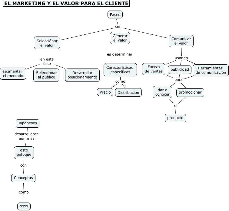 Este Cmap, tiene información relacionada con: Sin Título 2, Japoneses desarrollaron aún más este enfoque, Fuerza de ventas para promocionar, Selecciónar el valor en esta fase Seleccionar al público, promocionar el producto, Selecciónar el valor en esta fase Desarrollar posicionamiento, Fases son Comunicar el valor, publicidad para dar a conocer, Características específicas como Precio, este enfoque con Conceptos, Comunicar el valor usando publicidad, Características específicas como Distribución, Conceptos como ????, Herramientas de comunicación para dar a conocer, Fuerza de ventas para dar a conocer, Generar el valor es determinar Características específicas, Herramientas de comunicación para promocionar, Fases son Generar el valor, dar a conocer el producto, Fases son Selecciónar el valor, Comunicar el valor usando Herramientas de comunicación