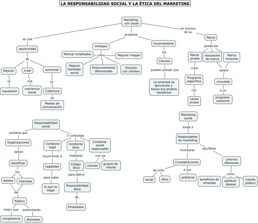 Este Cmap, tiene información relacionada con: Comercial1.4, Ventajas como Motivar empleados, crear una conciencia social, criterios diferentes como interés público, Legalidad para saber lo que es ilegal, Responsabilidad social 3 conductas Conducta ética, criterios diferentes como satifacer deseos, Conducta social responsable con los grupos de interés, Conducta ética mediante Código ético, oportunidad de crear, Ventajas como Mejorar bienestar social, Ventajas como Posicionamiento diferenciado, Responsabilidad social 3 conductas Conducta social responsable, Clientes pueden pensar que La empresa se aprovecha y busca sus propios beneficios, Mejorar su reputación, Responsabilidad social sostiene que Organizaciones, Consideraciones a sus prácticas, identificar los intereses, Marca puede ser Marca conjunta, Marketing con causa presenta Inconveniente, Marca propia crear Programa específico