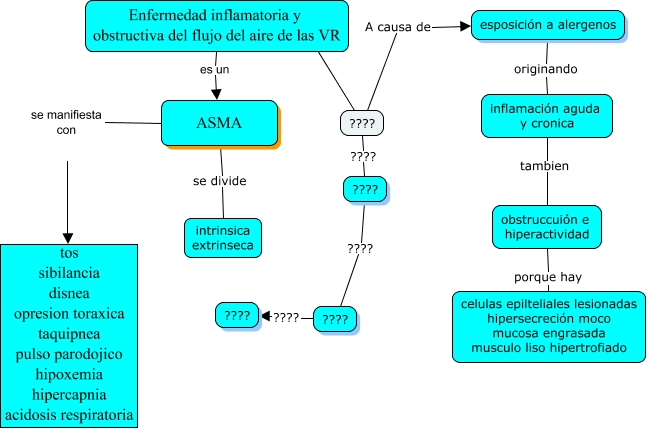 Este Cmap, tiene información relacionada con: mapamental lisbell, obstruccuión e hiperactividad porque hay celulas epilteliales lesionadas hipersecreción moco mucosa engrasada musculo liso hipertrofiado, Enfermedad inflamatoria y obstructiva del flujo del aire de las VR ???? ????, Enfermedad inflamatoria y obstructiva del flujo del aire de las VR es un ASMA, ASMA se divide intrinsica extrinseca, ???? ???? ????, ???? ???? ????, ???? ???? ????, inflamación aguda y cronica tambien obstruccuión e hiperactividad, ???? A causa de esposición a alergenos, ASMA se manifiesta con tos sibilancia disnea opresion toraxica taquipnea pulso parodojico hipoxemia hipercapnia acidosis respiratoria, esposición a alergenos originando inflamación aguda y cronica