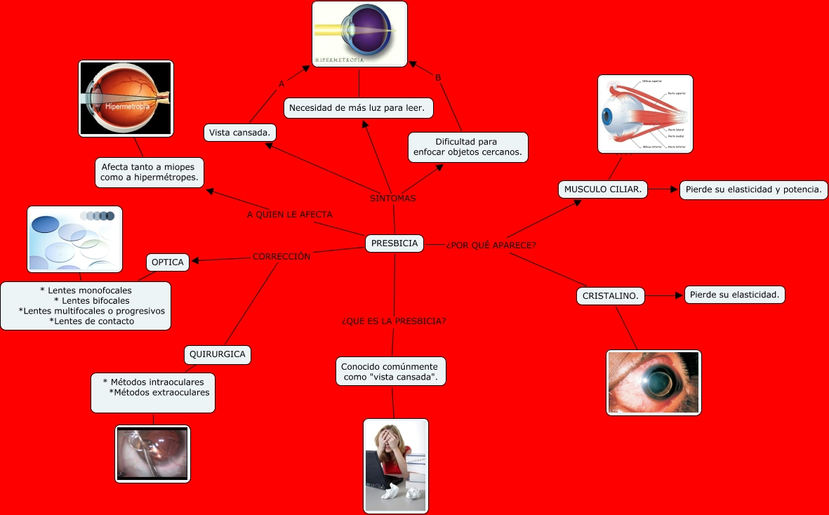 Este Cmap, tiene información relacionada con: ANALLELYMONTIELPADILLA3TM4PRESBICIA, Afecta tanto a miopes como a hipermétropes. ????, PRESBICIA ¿POR QUÉ APARECE? MUSCULO CILIAR., * Métodos intraoculares *Métodos extraoculares ????, QUIRURGICA ???? * Métodos intraoculares *Métodos extraoculares, CRISTALINO. ????, CRISTALINO. ???? Pierde su elasticidad., * Lentes monofocales * Lentes bifocales *Lentes multifocales o progresivos *Lentes de contacto ????, PRESBICIA SINTOMAS Dificultad para enfocar objetos cercanos., Dificultad para enfocar objetos cercanos. B, PRESBICIA SINTOMAS Necesidad de más luz para leer., PRESBICIA CORRECCIÓN QUIRURGICA, PRESBICIA CORRECCIÓN OPTICA, MUSCULO CILIAR. ????, PRESBICIA SINTOMAS Vista cansada., MUSCULO CILIAR. ???? Pierde su elasticidad y potencia., PRESBICIA A QUIEN LE AFECTA Afecta tanto a miopes como a hipermétropes., ???? Necesidad de más luz para leer., PRESBICIA ¿POR QUÉ APARECE? CRISTALINO., OPTICA ???? * Lentes monofocales * Lentes bifocales *Lentes multifocales o progresivos *Lentes de contacto, Vista cansada. A