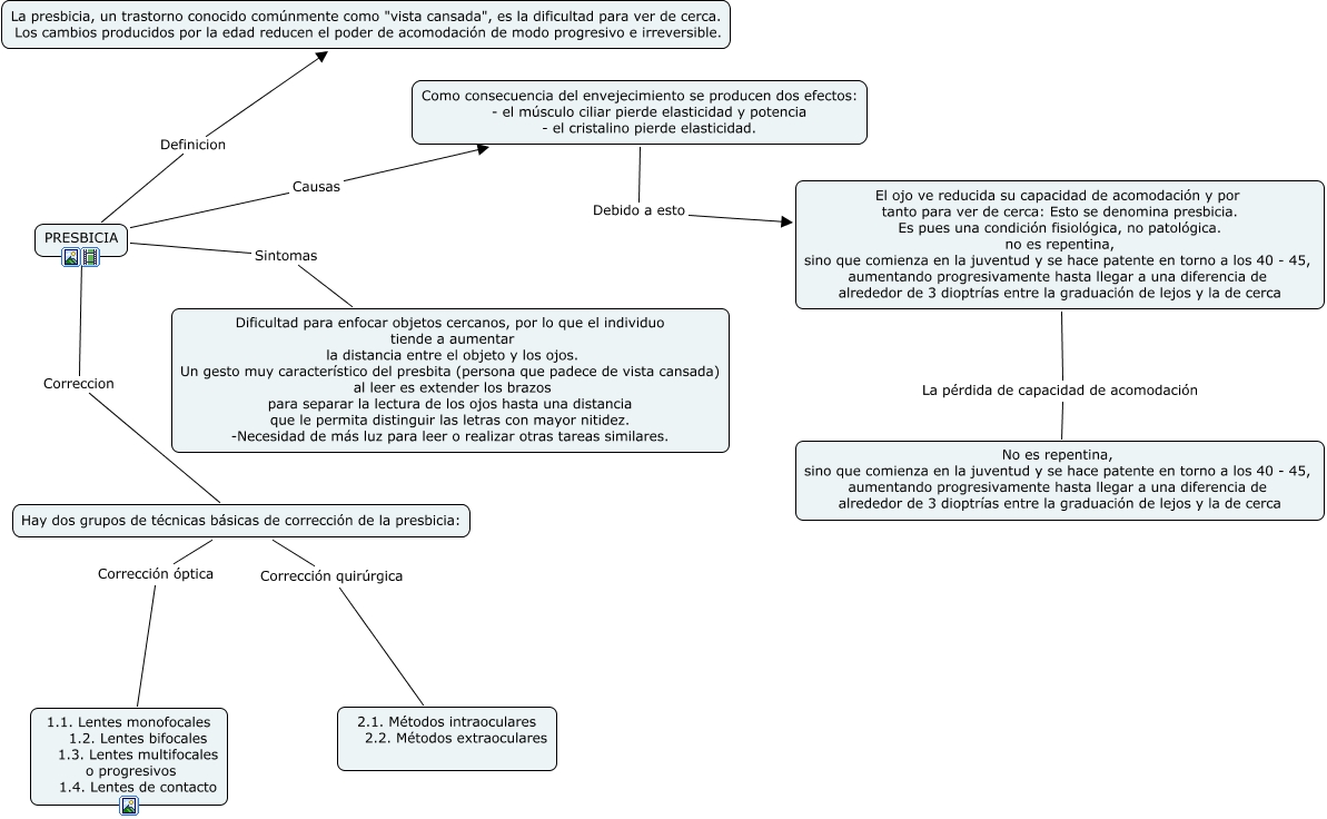 Este Cmap, tiene información relacionada con: presbicia mauricio rivera gonzalez3tm1, PRESBICIA Correccion Hay dos grupos de técnicas básicas de corrección de la presbicia:, El ojo ve reducida su capacidad de acomodación y por tanto para ver de cerca: Esto se denomina presbicia. Es pues una condición fisiológica, no patológica. no es repentina, sino que comienza en la juventud y se hace patente en torno a los 40 - 45, aumentando progresivamente hasta llegar a una diferencia de alrededor de 3 dioptrías entre la graduación de lejos y la de cerca La pérdida de capacidad de acomodación No es repentina, sino que comienza en la juventud y se hace patente en torno a los 40 - 45, aumentando progresivamente hasta llegar a una diferencia de alrededor de 3 dioptrías entre la graduación de lejos y la de cerca, PRESBICIA Causas Como consecuencia del envejecimiento se producen dos efectos: - el músculo ciliar pierde elasticidad y potencia - el cristalino pierde elasticidad., Hay dos grupos de técnicas básicas de corrección de la presbicia: Corrección quirúrgica 2.1. Métodos intraoculares 2.2. Métodos extraoculares, PRESBICIA Definicion La presbicia, un trastorno conocido comúnmente como "vista cansada", es la dificultad para ver de cerca. Los cambios producidos por la edad reducen el poder de acomodación de modo progresivo e irreversible., Como consecuencia del envejecimiento se producen dos efectos: - el músculo ciliar pierde elasticidad y potencia - el cristalino pierde elasticidad. Debido a esto El ojo ve reducida su capacidad de acomodación y por tanto para ver de cerca: Esto se denomina presbicia. Es pues una condición fisiológica, no patológica. no es repentina, sino que comienza en la juventud y se hace patente en torno a los 40 - 45, aumentando progresivamente hasta llegar a una diferencia de alrededor de 3 dioptrías entre la graduación de lejos y la de cerca, Hay dos grupos de técnicas básicas de corrección de la presbicia: Corrección óptica 1.1. Lentes monofocales 1.2. Lentes bifocales 1.3. Lentes multifocales o progresivos 1.4. Lentes de contacto, PRESBICIA Sintomas Dificultad para enfocar objetos cercanos, por lo que el individuo tiende a aumentar la distancia entre el objeto y los ojos. Un gesto muy característico del presbita (persona que padece de vista cansada) al leer es extender los brazos para separar la lectura de los ojos hasta una distancia que le permita distinguir las letras con mayor nitidez. -Necesidad de más luz para leer o realizar otras tareas similares.