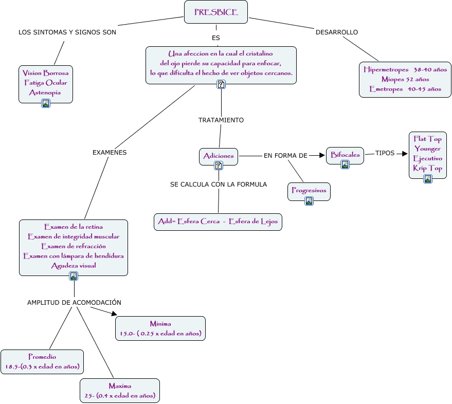 This Concept Map, created with IHMC CmapTools, has information related to: CONTRERAS ALONSO THALIA3TM1, Examen de la retina Examen de integridad muscular Examen de refracción Examen con lámpara de hendidura Agudeza visual AMPLITUD DE ACOMODACIÓN Minima 15.0- ( 0.25 x edad en años), Adiciones EN FORMA DE Bifocales, Bifocales TIPOS Flat Top Younger Ejecutivo Krip Top, PRESBICE ES Una afeccion en la cual el cristalino del ojo pierde su capacidad para enfocar, lo que dificulta el hecho de ver objetos cercanos., Adiciones SE CALCULA CON LA FORMULA Add= Esfera Cerca - Esfera de Lejos, Una afeccion en la cual el cristalino del ojo pierde su capacidad para enfocar, lo que dificulta el hecho de ver objetos cercanos. TRATAMIENTO Adiciones, Adiciones EN FORMA DE Progresivos, Examen de la retina Examen de integridad muscular Examen de refracción Examen con lámpara de hendidura Agudeza visual AMPLITUD DE ACOMODACIÓN Promedio 18.5-(0.3 x edad en años), Una afeccion en la cual el cristalino del ojo pierde su capacidad para enfocar, lo que dificulta el hecho de ver objetos cercanos. EXAMENES Examen de la retina Examen de integridad muscular Examen de refracción Examen con lámpara de hendidura Agudeza visual, PRESBICE LOS SINTOMAS Y SIGNOS SON Vision Borrosa Fatiga Ocular Astenopia, PRESBICE DESARROLLO Hipermetropes 38-40 años Miopes 52 años Emetropes 40-45 años, Examen de la retina Examen de integridad muscular Examen de refracción Examen con lámpara de hendidura Agudeza visual AMPLITUD DE ACOMODACIÓN Maxima 25- (0.4 x edad en años)