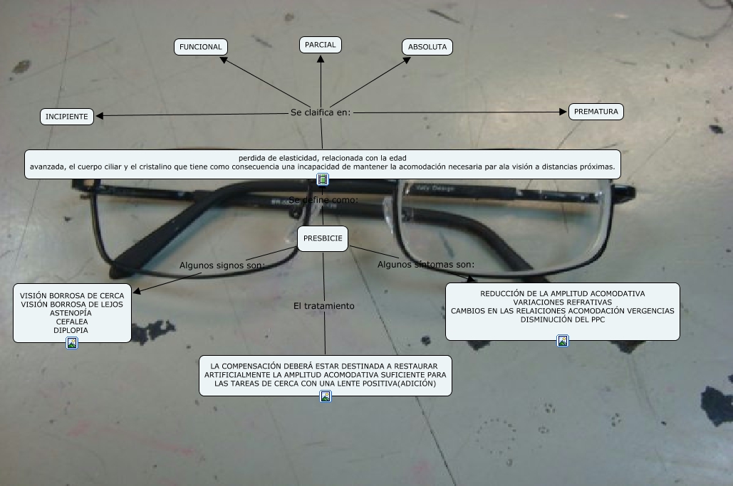 Este Cmap, tiene información relacionada con: RAMIREZBOTELLOBENJAMIN3TM1PRESBICIE, perdida de elasticidad, relacionada con la edad avanzada, el cuerpo ciliar y el cristalino que tiene como consecuencia una incapacidad de mantener la acomodación necesaria par ala visión a distancias próximas. Se claifica en: ABSOLUTA, perdida de elasticidad, relacionada con la edad avanzada, el cuerpo ciliar y el cristalino que tiene como consecuencia una incapacidad de mantener la acomodación necesaria par ala visión a distancias próximas. Se claifica en: PARCIAL, PRESBICIE Algunos síntomas son: REDUCCIÓN DE LA AMPLITUD ACOMODATIVA VARIACIONES REFRATIVAS CAMBIOS EN LAS RELAICIONES ACOMODACIÓN VERGENCIAS DISMINUCIÓN DEL PPC, perdida de elasticidad, relacionada con la edad avanzada, el cuerpo ciliar y el cristalino que tiene como consecuencia una incapacidad de mantener la acomodación necesaria par ala visión a distancias próximas. Se claifica en: PREMATURA, perdida de elasticidad, relacionada con la edad avanzada, el cuerpo ciliar y el cristalino que tiene como consecuencia una incapacidad de mantener la acomodación necesaria par ala visión a distancias próximas. Se claifica en: FUNCIONAL, PRESBICIE Algunos signos son: VISIÓN BORROSA DE CERCA VISIÓN BORROSA DE LEJOS ASTENOPÍA CEFALEA DIPLOPIA, PRESBICIE Se define como: perdida de elasticidad, relacionada con la edad avanzada, el cuerpo ciliar y el cristalino que tiene como consecuencia una incapacidad de mantener la acomodación necesaria par ala visión a distancias próximas., perdida de elasticidad, relacionada con la edad avanzada, el cuerpo ciliar y el cristalino que tiene como consecuencia una incapacidad de mantener la acomodación necesaria par ala visión a distancias próximas. Se claifica en: INCIPIENTE, PRESBICIE El tratamiento LA COMPENSACIÓN DEBERÁ ESTAR DESTINADA A RESTAURAR ARTIFICIALMENTE LA AMPLITUD ACOMODATIVA SUFICIENTE PARA LAS TAREAS DE CERCA CON UNA LENTE POSITIVA(ADICIÓN)