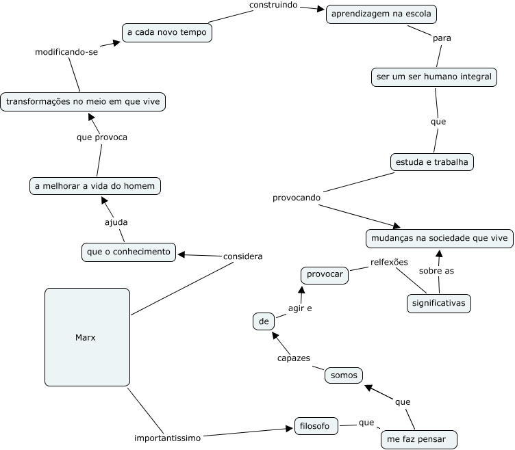 Esse mapa conceitual, produzido no IHMC CmapTools, tem a informação relacionada a: primeiro mapa, Marx considera que o conhecimento, transformações no meio em que vive modificando-se a cada novo tempo, aprendizagem na escola para ser um ser humano integral, Marx importantissimo filosofo, somos capazes de, a cada novo tempo construindo aprendizagem na escola, ser um ser humano integral que estuda e trabalha, estuda e trabalha provocando mudanças na sociedade que vive, me faz pensar que somos, a melhorar a vida do homem que provoca transformações no meio em que vive, provocar relfexões significativas, significativas sobre as mudanças na sociedade que vive, que o conhecimento ajuda a melhorar a vida do homem, filosofo que me faz pensar, de agir e provocar, me faz pensar que somos