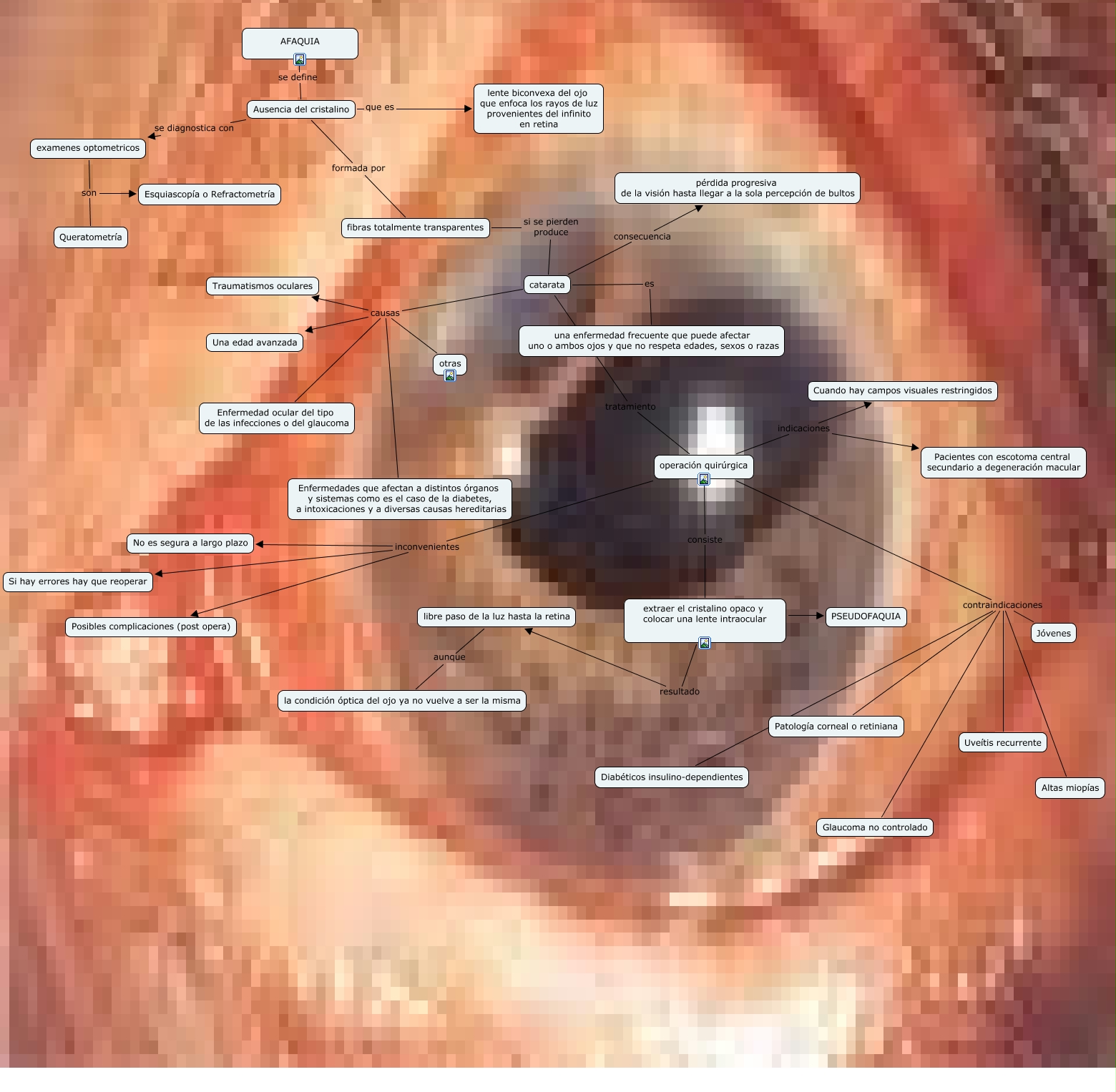 Este Cmap, tiene información relacionada con: AfaquiaMaricarmenJeniferCabazosGarcia3TM1, operación quirúrgica inconvenientes Si hay errores hay que reoperar, operación quirúrgica indicaciones Cuando hay campos visuales restringidos, operación quirúrgica consiste extraer el cristalino opaco y colocar una lente intraocular, operación quirúrgica contraindicaciones Diabéticos insulino-dependientes, catarata causas Enfermedad ocular del tipo de las infecciones o del glaucoma, operación quirúrgica indicaciones Pacientes con escotoma central secundario a degeneración macular, extraer el cristalino opaco y colocar una lente intraocular resultado libre paso de la luz hasta la retina, fibras totalmente transparentes si se pierden produce catarata, Ausencia del cristalino formada por fibras totalmente transparentes, catarata causas Enfermedades que afectan a distintos órganos y sistemas como es el caso de la diabetes, a intoxicaciones y a diversas causas hereditarias, catarata causas Traumatismos oculares, libre paso de la luz hasta la retina aunque la condición óptica del ojo ya no vuelve a ser la misma, operación quirúrgica contraindicaciones Altas miopías, extraer el cristalino opaco y colocar una lente intraocular PSEUDOFAQUIA, Ausencia del cristalino que es lente biconvexa del ojo que enfoca los rayos de luz provenientes del infinito en retina, catarata consecuencia pérdida progresiva de la visión hasta llegar a la sola percepción de bultos, examenes optometricos son Queratometría, operación quirúrgica contraindicaciones Jóvenes, catarata causas otras, catarata causas Una edad avanzada