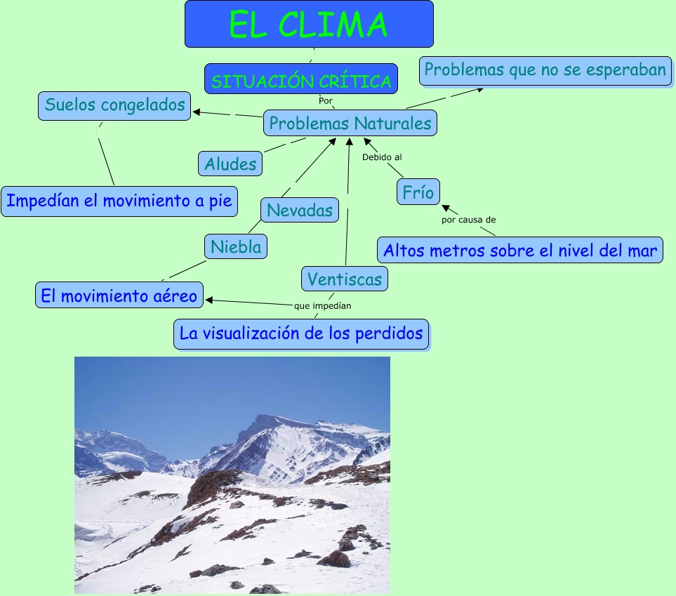 Este Cmap, tiene información relacionada con: Los Andes Clima, Problemas Naturales Aludes, Altos metros sobre el nivel del mar por causa de Frío, Ventiscas Problemas Naturales, Ventiscas que impedían El movimiento aéreo, Problemas Naturales Problemas que no se esperaban, Problemas Naturales Suelos congelados, SITUACIÓN CRÍTICA EL CLIMA, Ventiscas que impedían La visualización de los perdidos, Suelos congelados Impedían el movimiento a pie, Frío Debido al Problemas Naturales, SITUACIÓN CRÍTICA Por Problemas Naturales, Niebla Problemas Naturales, Niebla El movimiento aéreo