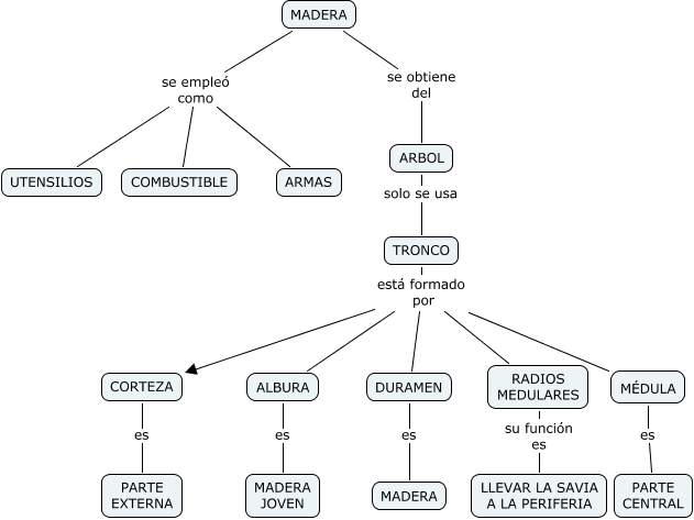 Este Cmap, tiene información relacionada con: Carmen López_ la madera, MÉDULA es PARTE CENTRAL, MADERA se empleó como COMBUSTIBLE, ALBURA es MADERA JOVEN, MADERA se empleó como UTENSILIOS, TRONCO está formado por CORTEZA, TRONCO está formado por MÉDULA, TRONCO está formado por RADIOS MEDULARES, ARBOL solo se usa TRONCO, RADIOS MEDULARES su función es LLEVAR LA SAVIA A LA PERIFERIA, MADERA se obtiene del ARBOL, TRONCO está formado por DURAMEN, CORTEZA es PARTE EXTERNA, TRONCO está formado por ALBURA, MADERA se empleó como ARMAS, DURAMEN es MADERA