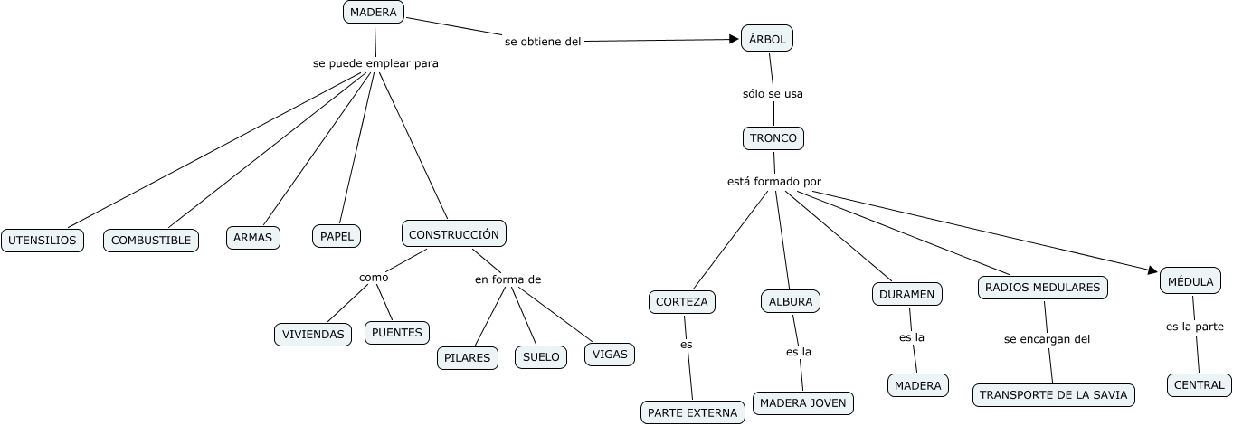Este Cmap, tiene información relacionada con: Begoña LA MADERA, MADERA se puede emplear para UTENSILIOS, MADERA se obtiene del ÁRBOL, RADIOS MEDULARES se encargan del TRANSPORTE DE LA SAVIA, MADERA se puede emplear para ARMAS, CONSTRUCCIÓN en forma de SUELO, CONSTRUCCIÓN como VIVIENDAS, CONSTRUCCIÓN en forma de VIGAS, CONSTRUCCIÓN como PUENTES, ÁRBOL sólo se usa TRONCO, TRONCO está formado por RADIOS MEDULARES, CONSTRUCCIÓN en forma de PILARES, CORTEZA es PARTE EXTERNA, DURAMEN es la MADERA, MADERA se puede emplear para COMBUSTIBLE, TRONCO está formado por ALBURA, ALBURA es la MADERA JOVEN, TRONCO está formado por DURAMEN, MADERA se puede emplear para PAPEL, MÉDULA es la parte CENTRAL, TRONCO está formado por MÉDULA