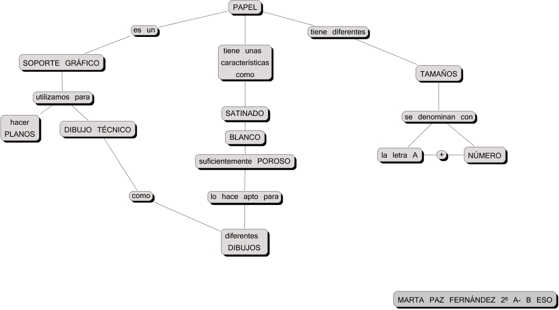 Este Cmap, tiene información relacionada con: Marta Paz_El papel, PAPEL tiene unas características como SATINADO, la letra A + NÚMERO, PAPEL es un SOPORTE GRÁFICO, diferentes DIBUJOS como DIBUJO TÉCNICO, suficientemente POROSO lo hace apto para diferentes DIBUJOS, SOPORTE GRÁFICO utilizamos para DIBUJO TÉCNICO, PAPEL tiene unas características como BLANCO, TAMAÑOS se denominan con NÚMERO, PAPEL tiene diferentes TAMAÑOS, PAPEL tiene unas características como suficientemente POROSO, SOPORTE GRÁFICO utilizamos para hacer PLANOS, TAMAÑOS se denominan con la letra A