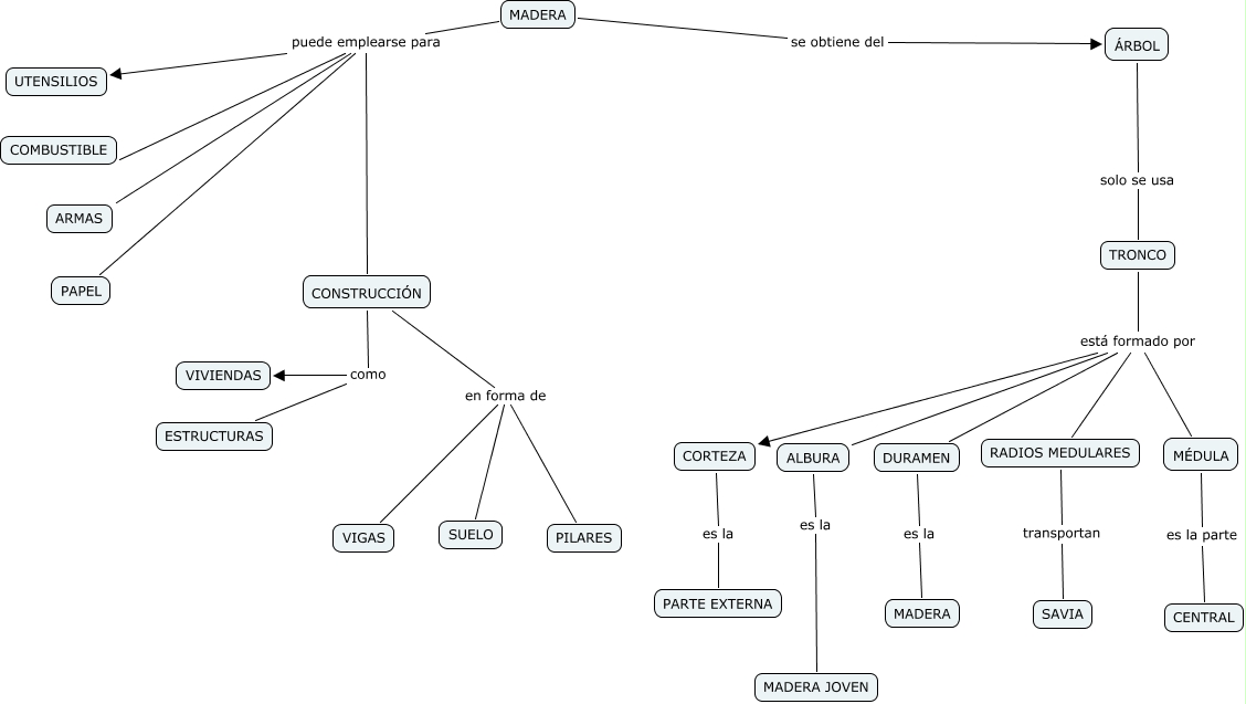 Este Cmap, tiene información relacionada con: MADERA, TRONCO está formado por ALBURA, RADIOS MEDULARES transportan SAVIA, CONSTRUCCIÓN como ESTRUCTURAS, MADERA puede emplearse para CONSTRUCCIÓN, CONSTRUCCIÓN como VIVIENDAS, TRONCO está formado por RADIOS MEDULARES, TRONCO está formado por DURAMEN, MADERA se obtiene del ÁRBOL, MADERA puede emplearse para PAPEL, TRONCO está formado por MÉDULA, DURAMEN es la MADERA, MADERA puede emplearse para ARMAS, ALBURA es la MADERA JOVEN, CONSTRUCCIÓN en forma de PILARES, ÁRBOL solo se usa TRONCO, MADERA puede emplearse para UTENSILIOS, TRONCO está formado por CORTEZA, CORTEZA es la PARTE EXTERNA, CONSTRUCCIÓN en forma de SUELO, MÉDULA es la parte CENTRAL