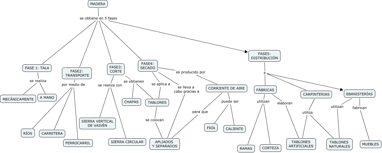 Este Cmap, tiene información relacionada con: obtención de La madera- Begoña, CORRIENTE DE AIRE para que APLIADOS Y SEPARADOS, FASE5: DISTRIBUCIÓN a CARPINTERIAS, FASE2: TRANSPORTE por medio de CARRETERA, FASE5: DISTRIBUCIÓN a EBANISTERÍAS, FÁBRICAS utilizan RAMAS, FASE3: CORTE se obtienen CHAPAS, CORRIENTE DE AIRE puede ser CALIENTE, FÁBRICAS utilizan CORTEZA, EBANISTERÍAS fabrican MUEBLES, FASE 1: TALA se realiza A MANO, FASE4: SECADO es producido por CORRIENTE DE AIRE, MADERA se obtiene en 5 fases FASE3: CORTE, CARPINTERIAS utiliza TABLONES NATURALES, CORRIENTE DE AIRE puede ser FRÍA, FASE2: TRANSPORTE por medio de FERROCARRIL, TABLONES se colocan APLIADOS Y SEPARADOS, FASE 1: TALA se realiza MECÁNICAMENTE, FASE5: DISTRIBUCIÓN a FÁBRICAS, FASE4: SECADO se lleva a cabo gracias a APLIADOS Y SEPARADOS, FASE3: CORTE se obtienen TABLONES