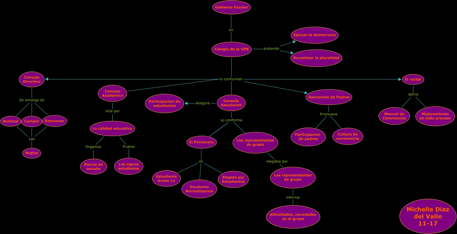 This Concept Map, created with IHMC CmapTools, has information related to: GobEscolar3, Asociacion de Padres Promueve Cultura de convivencia, El Personero es Elegido por Estudiantes, Colegio de la UPB lo conforman El rector, Consejo Academico lo conforman El rector, Consejo Estudiantil Lo conforma Los representantes de grado, Cumplir Las Reglas, Colegio de la UPB lo conforman Consejo Estudiantil, Consejo Estudiantil Lo conforma El Personero, Los representantes de grado elegidos por Los representantes de grupo, El rector aplica Manual de Convivencia, Consejo Estudiantil Asegura Participacion de estudiantes, Consejo Directivo Se encarga de Cumplir, El Personero es Estudiante Grado 11, Consejo Academico Vela por La calidad educativa, Colegio de la UPB pretende Garantizar la pluralidad, Consejo Directivo Se encarga de Realizar, Consejo Directivo Se encarga de Sancionar, Realizar Las Reglas, Los representantes de grupo informa dificultades, novedades en el grupo, Colegio de la UPB lo conforman Consejo Directivo