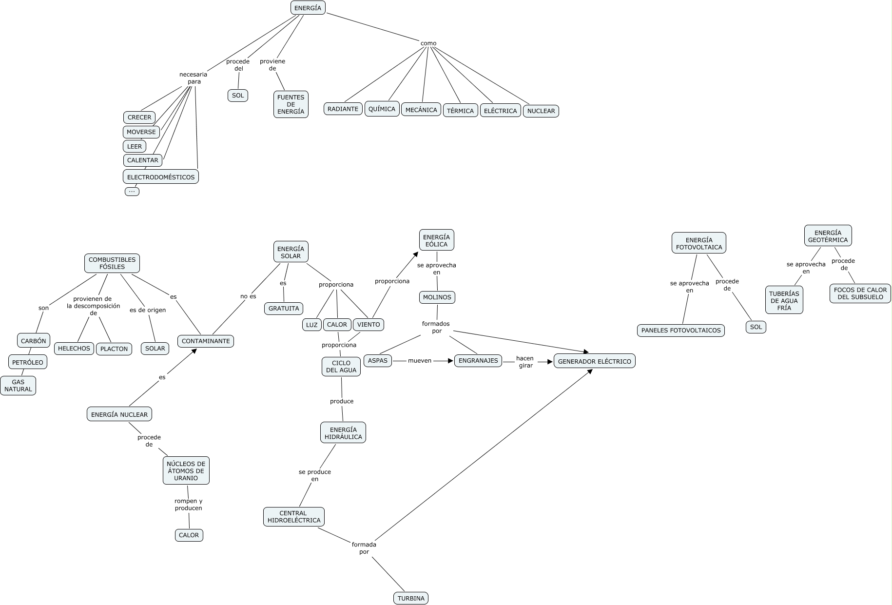 Este Cmap, tiene información relacionada con: 3esoa.energia_02_raquel, ENERGÍA como NUCLEAR, NÚCLEOS DE ÁTOMOS DE URANIO rompen y producen CALOR, ENERGÍA procede del SOL, ENERGÍA GEOTÉRMICA se aprovecha en TUBERÍAS DE AGUA FRÍA, COMBUSTIBLES FÓSILES es de origen SOLAR, ENERGÍA como QUÍMICA, ENERGÍA necesaria para CRECER, ENERGÍA NUCLEAR es CONTAMINANTE, CENTRAL HIDROELÉCTRICA formada por GENERADOR ELÉCTRICO, VIENTO proporciona CICLO DEL AGUA, CICLO DEL AGUA produce ENERGÍA HIDRÁULICA, ENERGÍA EÓLICA se aprovecha en MOLINOS, ENERGÍA SOLAR es GRATUITA, CALOR proporciona CICLO DEL AGUA, ENERGÍA FOTOVOLTAICA procede de SOL, ENERGÍA como TÉRMICA, ENERGÍA NUCLEAR procede de NÚCLEOS DE ÁTOMOS DE URANIO, CENTRAL HIDROELÉCTRICA formada por TURBINA, ENERGÍA SOLAR proporciona VIENTO, ENERGÍA como MECÁNICA