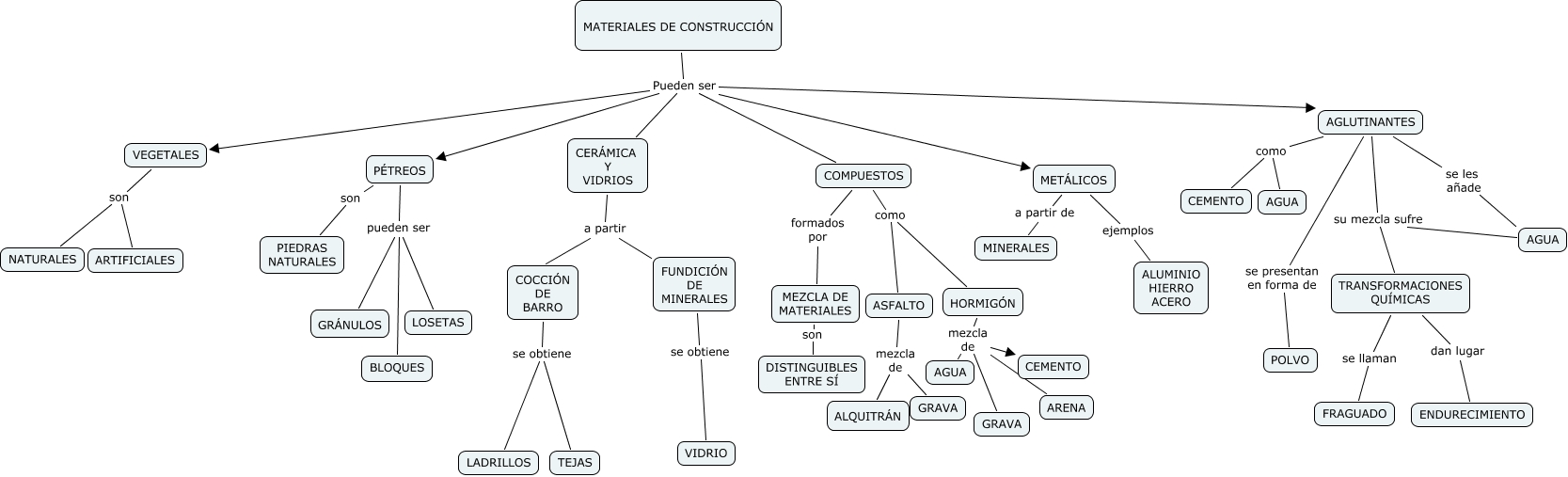 Este Cmap, tiene información relacionada con: 3esoa.materialesdeconstruccion_01_raquel, AGLUTINANTES se presentan en forma de POLVO, COMPUESTOS como HORMIGÓN, CERÁMICA Y VIDRIOS a partir COCCIÓN DE BARRO, MATERIALES DE CONSTRUCCIÓN Pueden ser AGLUTINANTES, AGUA su mezcla sufre TRANSFORMACIONES QUÍMICAS, HORMIGÓN mezcla de CEMENTO, CERÁMICA Y VIDRIOS a partir FUNDICIÓN DE MINERALES, MATERIALES DE CONSTRUCCIÓN Pueden ser VEGETALES, MEZCLA DE MATERIALES son DISTINGUIBLES ENTRE SÍ, TRANSFORMACIONES QUÍMICAS dan lugar ENDURECIMIENTO, VEGETALES son NATURALES, MATERIALES DE CONSTRUCCIÓN Pueden ser METÁLICOS, COMPUESTOS como ASFALTO, ASFALTO mezcla de GRAVA, TRANSFORMACIONES QUÍMICAS se llaman FRAGUADO, HORMIGÓN mezcla de GRAVA, AGLUTINANTES se les añade AGUA, COCCIÓN DE BARRO se obtiene TEJAS, MATERIALES DE CONSTRUCCIÓN Pueden ser PÉTREOS, PÉTREOS pueden ser GRÁNULOS