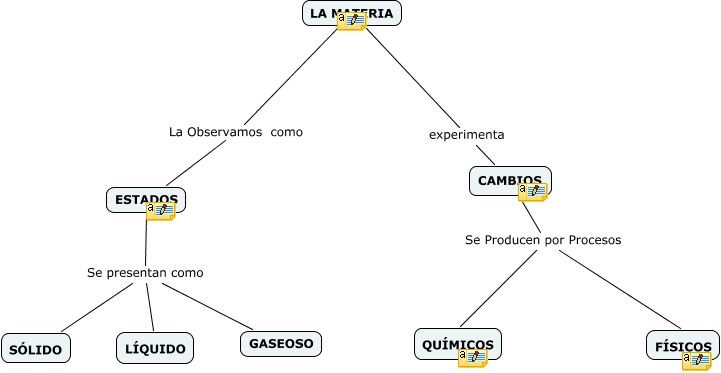 Este Cmap, tiene información relacionada con: los cambios de estado, ESTADOS Se presentan como GASEOSO, LA MATERIA La Observamos como ESTADOS, ESTADOS Se presentan como SÓLIDO, CAMBIOS Se Producen por Procesos QUÍMICOS, CAMBIOS Se Producen por Procesos FÍSICOS, ESTADOS Se presentan como LÍQUIDO, LA MATERIA experimenta CAMBIOS